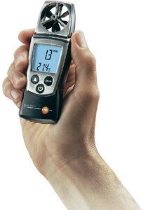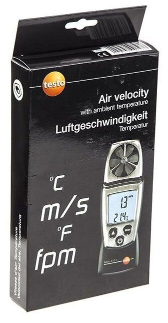Расчет среднего значения по времени Функция HOLD для фиксации текущего измеренного значения и отображение мин/макс значений Расчет температуры охлаждения ветром для применения на открытом воздухе Подсветка дисплея Внесён в Государственный реестр средств измерений РФ testo ; анемометр с крыльчаткой, со встроенным NTC сенсором измерения температуры воздуха, вкл. защитную крышку, батарейки и заводской протокол калибровки Компактный цифровой термоанемометр с встроенным крыльчатым дачтиком для измерения скорости и температуры воздушного потока. Рзультаты измерений могут отображаться в м/с, м/ч, км/ч, С/F, t охлаждения ветром Диапазон измерений: температуры -10…+50°С, погреш. ± 0,5°С; скорости: 0,4…20 м/с, погреш. ± 2%. Внесен в ГРСИ.
