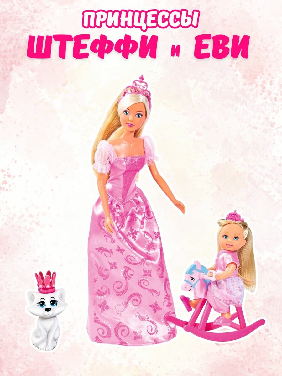 Куклы Simba Штеффи и Еви принцессы - целых две принцессы в наборе, которые точно понравятся Вашей девочке. С таким набором можно придумать множество интересных историй и сюжетов, например, как они играют друг с другом, беседуют, гуляют и многое другое. Особенности: Аксессуары: кошечка и собачка с короной, лошадка-качалка для маленькой Еви. С таким набором можно придумать множество интересных историй и сюжетов. Все детали и аксессуары выполнены из качественных материалов.