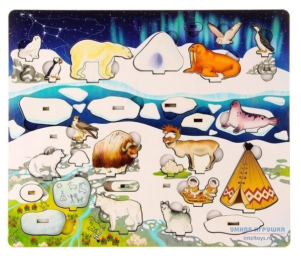 Набор «Под Большой Медведицей» (Арктика в 3D на твоем столе) 37х1,4х31 арт.7975 это увлекательная деревянная доска 3D, которая познакомит детей с Северным полюсом и его обитателями.Игра представляет собой деревянную панель 37 на 30 см в виде Арктики, в которой живут различные представители (люди в юртах, животные, растения).Все детали вынимаются и ставятся на специальные подставки, которые входят в набор.Игру Под Большой Медведицей можно использовать, как рамку вкладыш, подбирая всем деталькам окошки нужного размера.Такая игра будет одинаково полезна как деткам младшего возраста (2-3 годика) для развития моторики, глазомера (ведь найти нужную рамку и вставить туда элемент для маленьких детей очень сложно).Так же игра будет полезна для старших деток 3-5 лет для общего представления об Арктике, как называются животные, кто из животных самый большой, а кто самый опасный.Для удобства хранения, игра складывается: все выступающие над поверхностью детали укладываются в специальные отверстия прямо на доске.Размер доски: 37,5х30,5х1,2 см смРазмер вкладышей: от 9,5 до 1 см, минимальный вкладыш 2,5х1см.