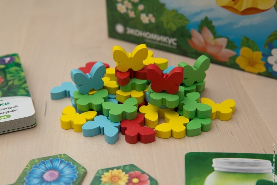 | Состав набора | 40 деревянных фишек бабочек + мешок 40 тайлов двойных цветов, 10 тайлов суперцветов, 4 стартовых тайла 21 карта находок, 4 карты банок (формат карт |
