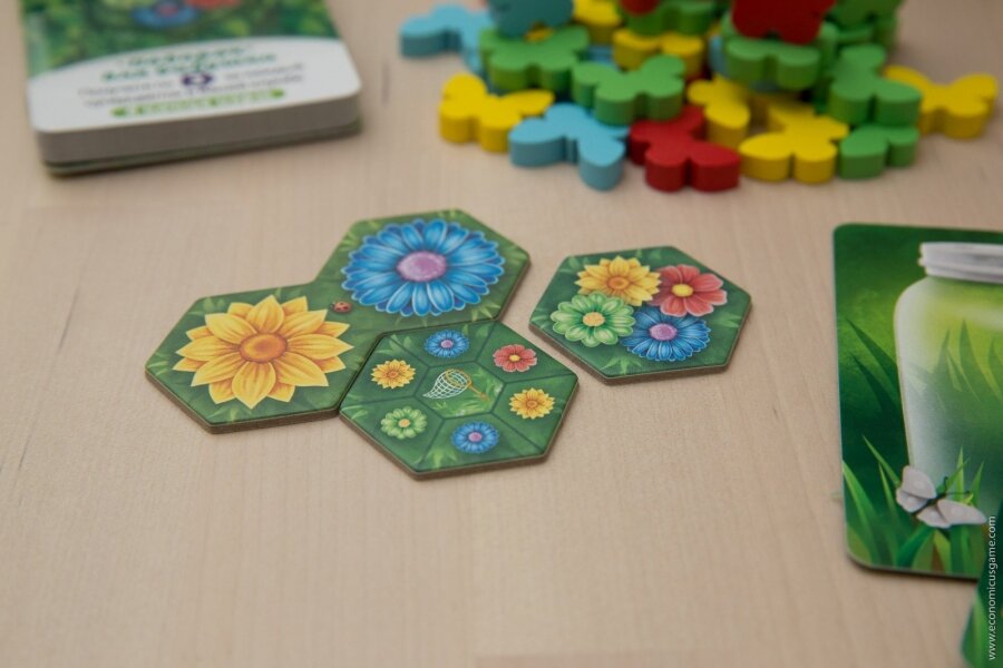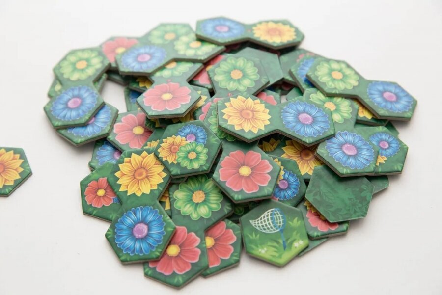 Игроки собирают из цветов разноцветную клумбу. На некоторые цветы можно приманивать бабочек. В конце игры на вашей клумбе считаются все поляны из соседствующих цветов одного цвета: число цветов каждой поляны умножается на число оказавшихся здесь бабочек. Побеждает тот, кто соберет лучшие поля: размер поля каждого цвета умножается на число бабочек на нем. Красивая семейная игра без острого прямого взаимодействия понравится любителям «Каркассона», «Лоскутного королевства», «Азула».