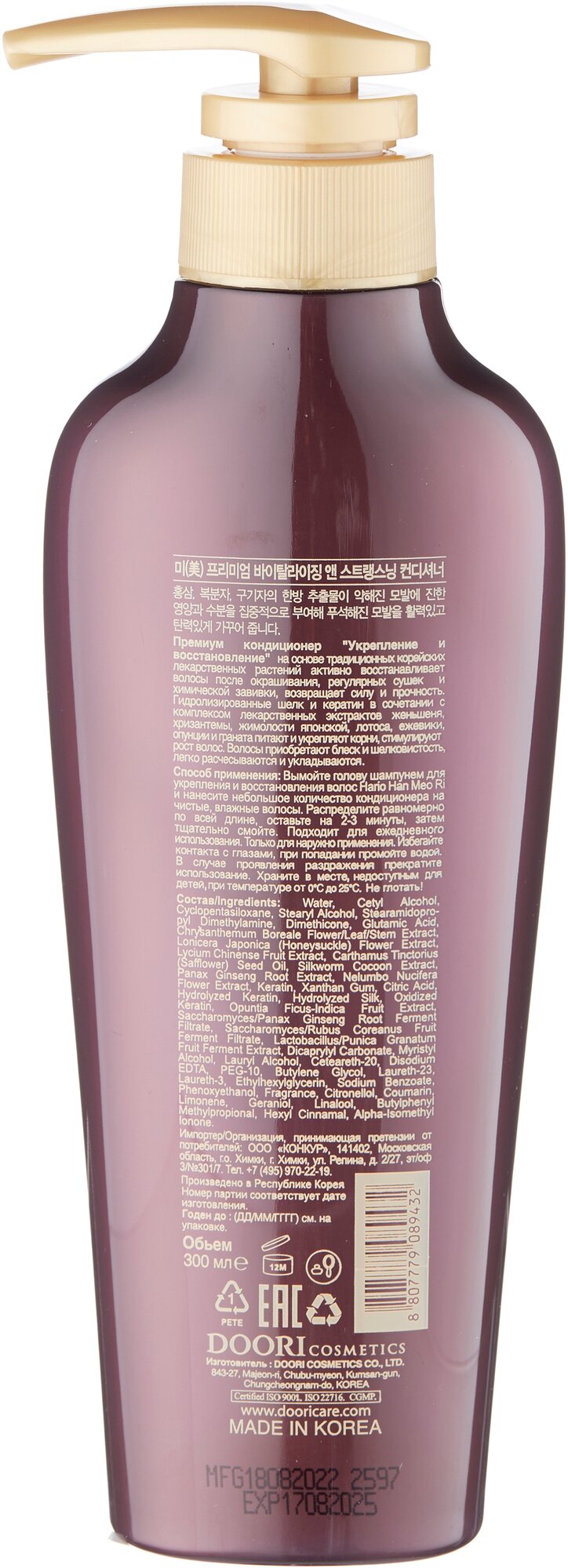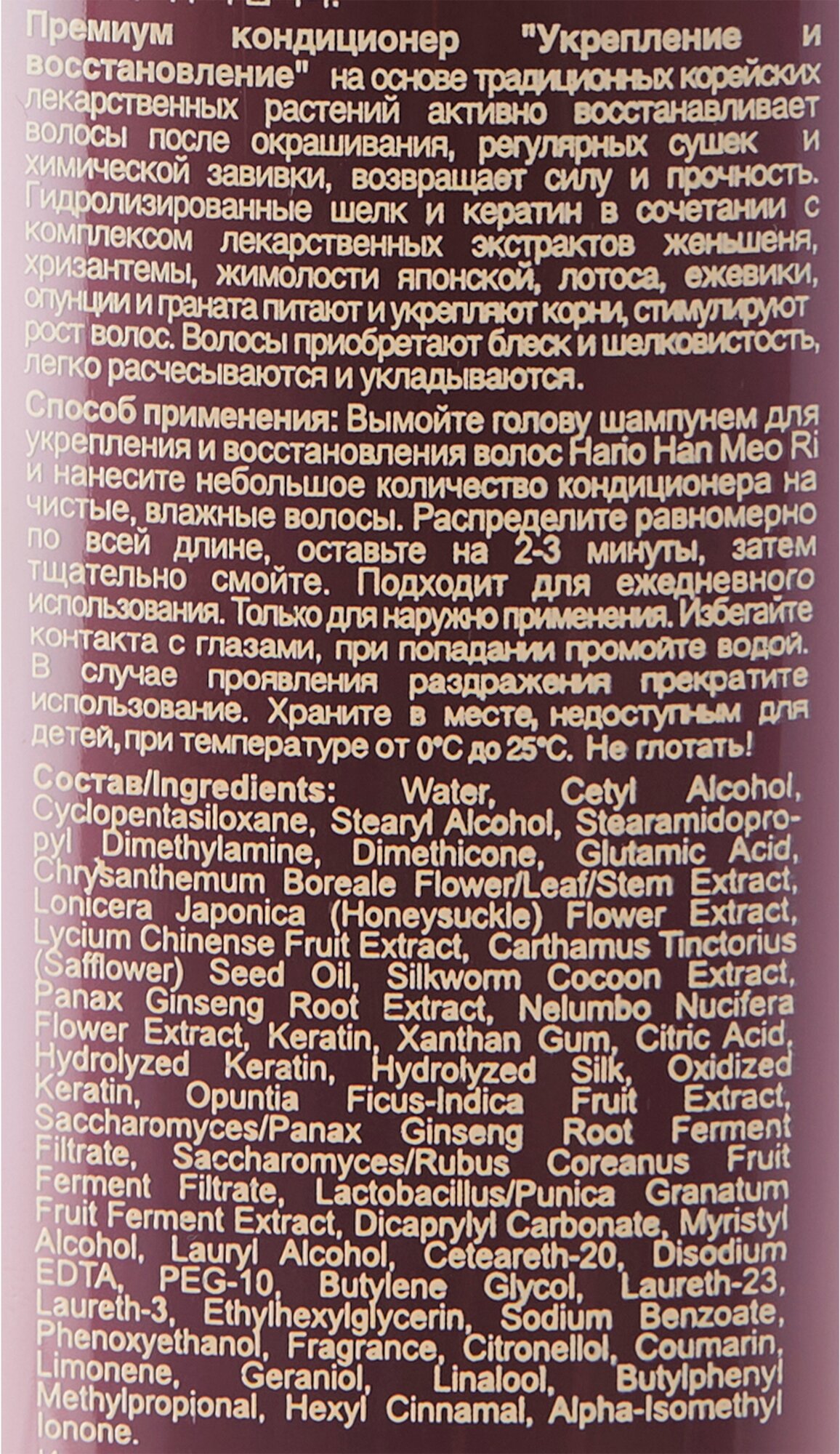 Премиум кондиционер "Укрепление и восстановление" на основе традиционных корейских лекарственных растений активно восстанавливает волосы после окрашивания, регулярных сушек и химической завивки, возвращает силу и прочность.
