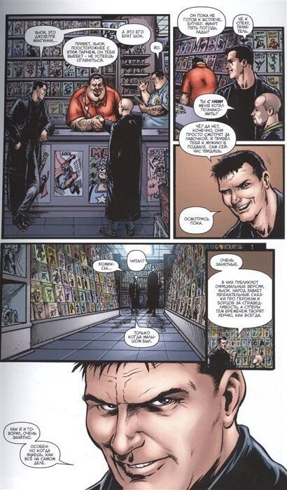 Как бы Эннис не перегибал с шутками ниже пояса, у него всё же выходит крайне смешной стёб, а финал истории, напрямую связанный со спасением мира – вероятно, лучшее, что было в супергеройских комиксах за долгое время. Серьёзно. В процессе расследования «людям в чёрном» предстоит посещение гей-бара и тут нам получше раскрывают характеры Малыша и Бурчера: первый, будучи обычным пацаном с района, демонстрирует явную гомофобию, подпитанную средой и слухами, второй предстает прагматиком и философом, умеющим дать простой ответ на непростой вопрос. На первый взгляд, комикс тотально-нетолерантен, но, пока вы ломаете голову, как же такое пропустили, создатели дают понять, что они за толерантность «с человеческим лицом»: каждый человек имеет право быть в своей личной жизни тем, кем он пожелает, но не стоит делать из этого культ и подстраивать под себя других людей. Также освещаются два важных момента: в мире «Пацанов» комиксы создаются про живых и действующих чуть ли не на каждом углу супергероев, но эти журнальчики с нарисованными картинками выступают в роли «оружия пропаганды», конкурируя с телевизором, и здесь же суперы приравнены к поп-звёздам, вынужденным плясать под дудку продюсеров, политиков, всевозможных фондов и общественных организаций, учитывая все подвижки в рейтингах и в актуальной моде.
