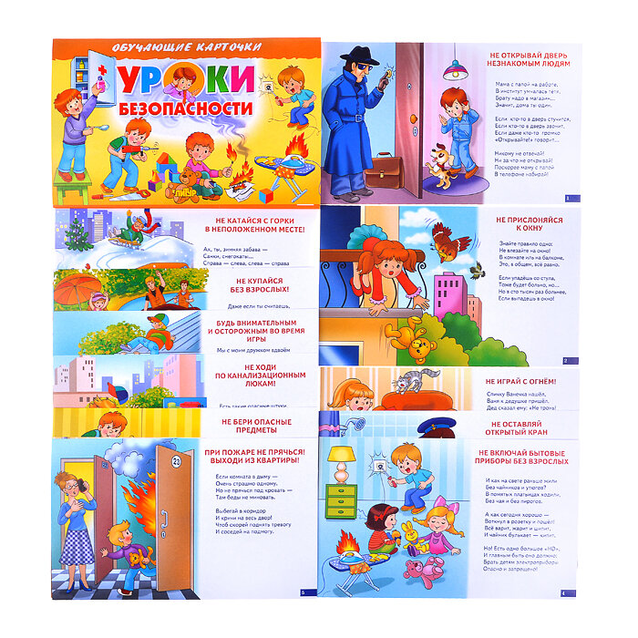 Карточки “Уроки безопасности” в стихотворной форме познакомят дошкольников с основными правилами безопасности дома и на улице.