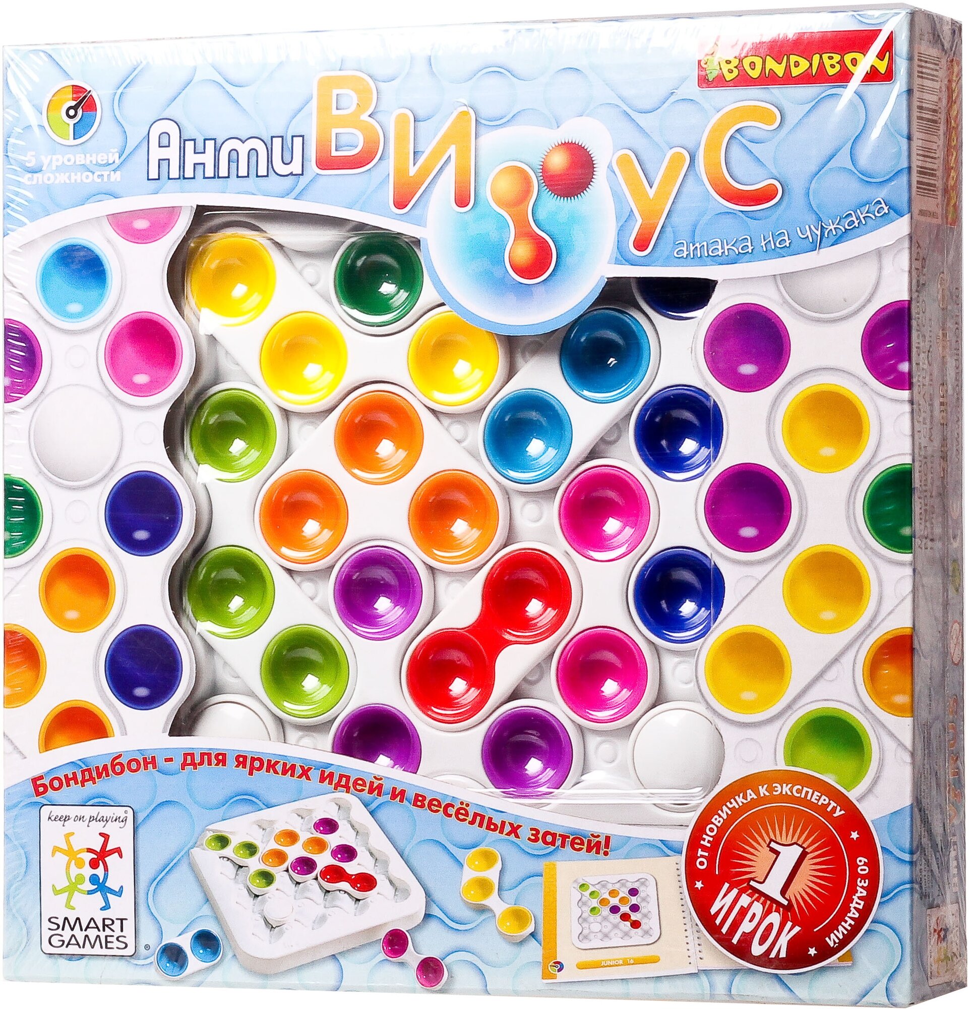 Логическая настольная игра антивирус с разнообразными заданиями от Bondibon захватит детей надолго! Разгадайте 3D головоломку серии Smartgames и вытесните красную деталь из системы! Выберите одно из 60 заданий и соответственно расположите детали на игровом поле. Передвигайте цветные элементы и постарайтесь переместить вирус к выходу. Белые детали должны оставаться на месте. Вы справились, если смогли вытеснить красный вирус за пределы игрового поля. Постепенно переходите к более сложным заданиям. Увлекательная игра, разработанная профессионалами, способствует развитию логики, гибкости мышления, цветовосприятия и внимания. А еще игра по принципу пятнашек станет отличным подарком для бабушки и дедушки, ведь тренировать мозг полезно в любом возрасте.О качестве и безопасности позаботился Бондибон.В набор входят: игровое поле, детали головоломки, буклет с заданиями. Возраст 8+ Количество игроков 1Соберите коллекцию развивающих логических игр серии Smartgames!