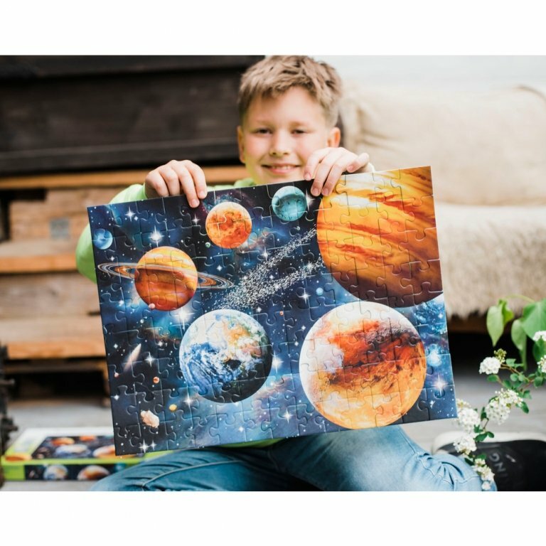 Пазл XXL познакомит ребенка с астрономическим явлением Парадом планет, при котором некоторые планеты нашей Солнечной системы оказываются в небольшом секторе по одну сторону от Солнца. Рисунок выполнен очень красочно. Он состоит из ста картонных элементов, хорошо стыкующихся между собой, благодаря технологии Softclick. Размер готовой картинки - 49 х 36 см.