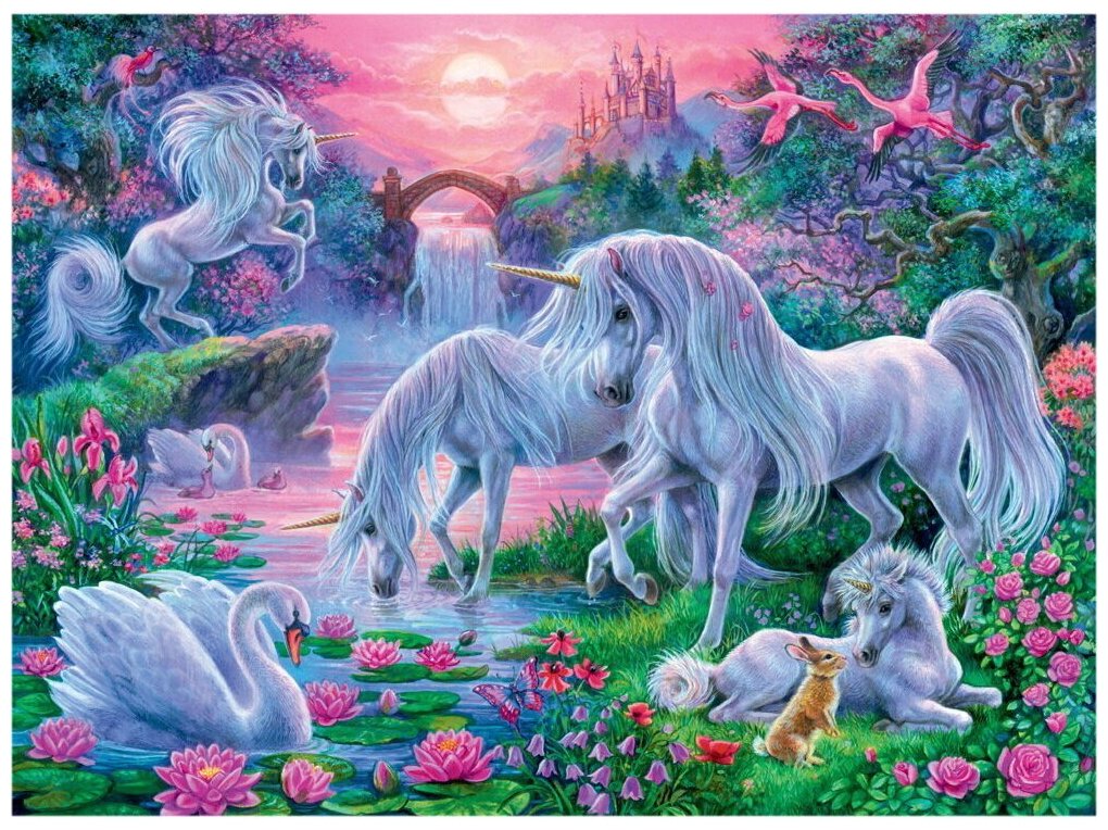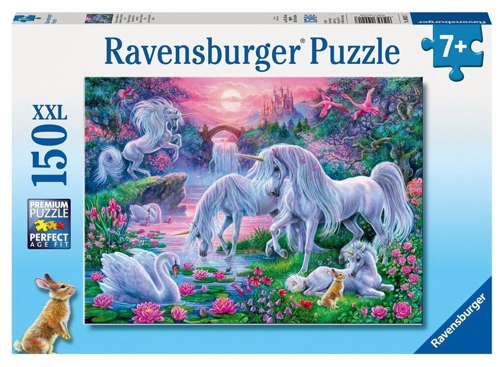 Очень красочный пазл Волшебное королевство действительно полон волшебства и таинственности. Яркие краски придают картинке очарования и с первого взгляда привлекут внимание ребенка. Пазл от бренда Ravensburger состоит из 150 элементов, которые складываются в волшебных единорогов, белых лебедей и даже маленького зайчонка у берега реки. Готовая картинка богата множеством различных оттенков, что делает собирание пазла достаточно увлекательным делом. В собранном виде такое Волшебное королевство может украсить детскую комнату.