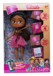 Кукла Boxy Girls по имени Номи - это одна из 4-х подружек-модниц Boxy Girls, которые без ума от шопинга и распаковки своих покупок. Номи Boxy Girls обожает блистать на любой вечеринке и выбирает для себя самые эффектные и модные наряды и аксессуары. Номи никогда не пройдет мимо пары стильных туфелек или модной сумочки. Вот и сейчас она получила 4 новых почтовых коробки с заказами из интернет-магазинов и уже готова распаковывать их вместе с Вами!Каждая кукла-девчонка Boxy Girls одета в яркую и модную одежду, а если собрать всех подружек вместе, получится целая модная тусовка! В каждом наборе с куколкой Boxy Girls Вы найдёте 4 коробочки-посылки, в каждой из которых находятся дополнительные кукольные аксессуары и украшения. Куклы Boxy Girls имеют красивые длинные волосы, шарнирные части тела и съёмную одежду.Состав коробочек из набора Бруклин Boxy Girls:сумочка, 2 наклейкисумочка, наклейка, карточкапара ботиночек, наклейка, карточкасерьги и браслет, карточка, наклейка