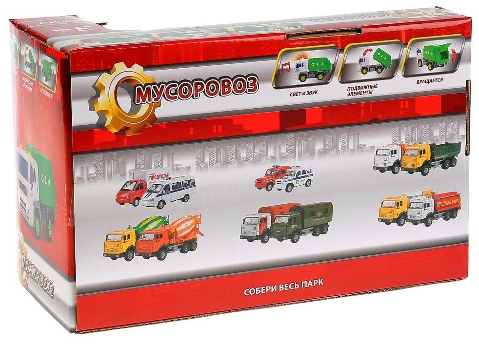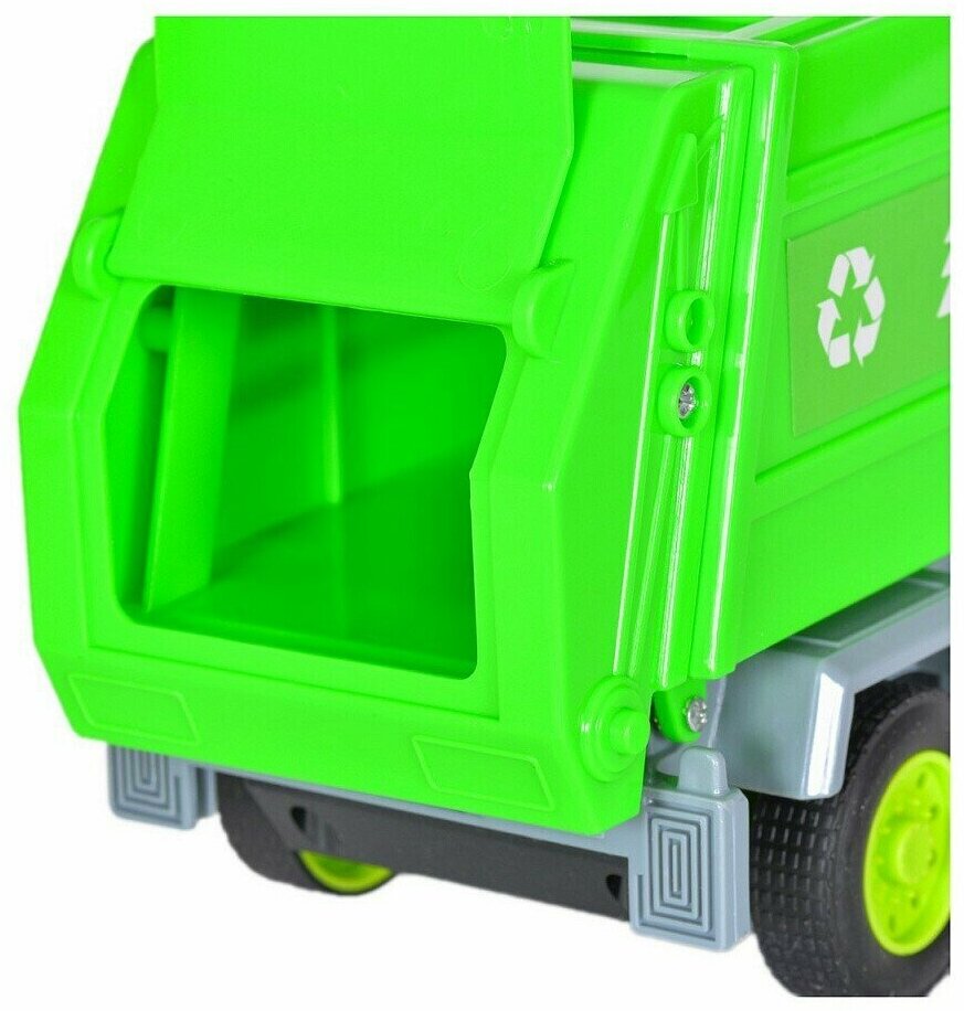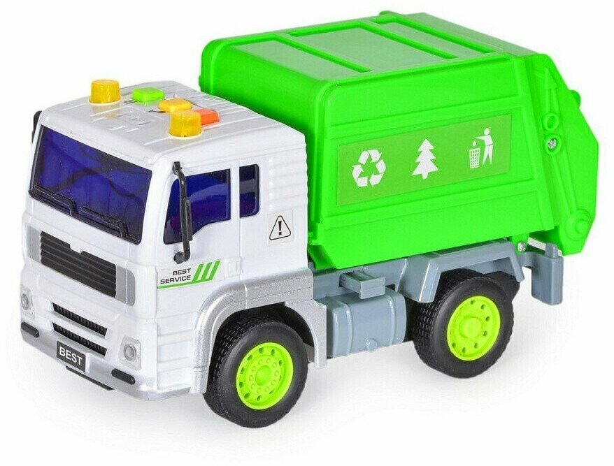 Инерционный Мусоровоз со светом и звуком приведёт в восторг любого мальчишку. Игрушечная машина реалистично детализирована и похожа на настоящий спецтранспорт, который дети видят на улицах города. Для того, чтобы ребёнку было интереснее играть, в машинку заложены световые и звуковые эффекты, которые включаются при нажатии на кнопку на крыше кабины. После этого у машины загораются проблесковые маячки и она воспроизводит различные звуки. Цвет кабины - белый, кузов выполнен в сочном зелёном цвете и дополнен клининговыми эмблемами. Мусоровоз оснащён инерционным механизмом: если машинку оттянуть назад и отпустить, она поедет самостоятельно. Игра с инерционными машинками хорошо тренирует мелкую моторику рук и координацию движений ребёнка.