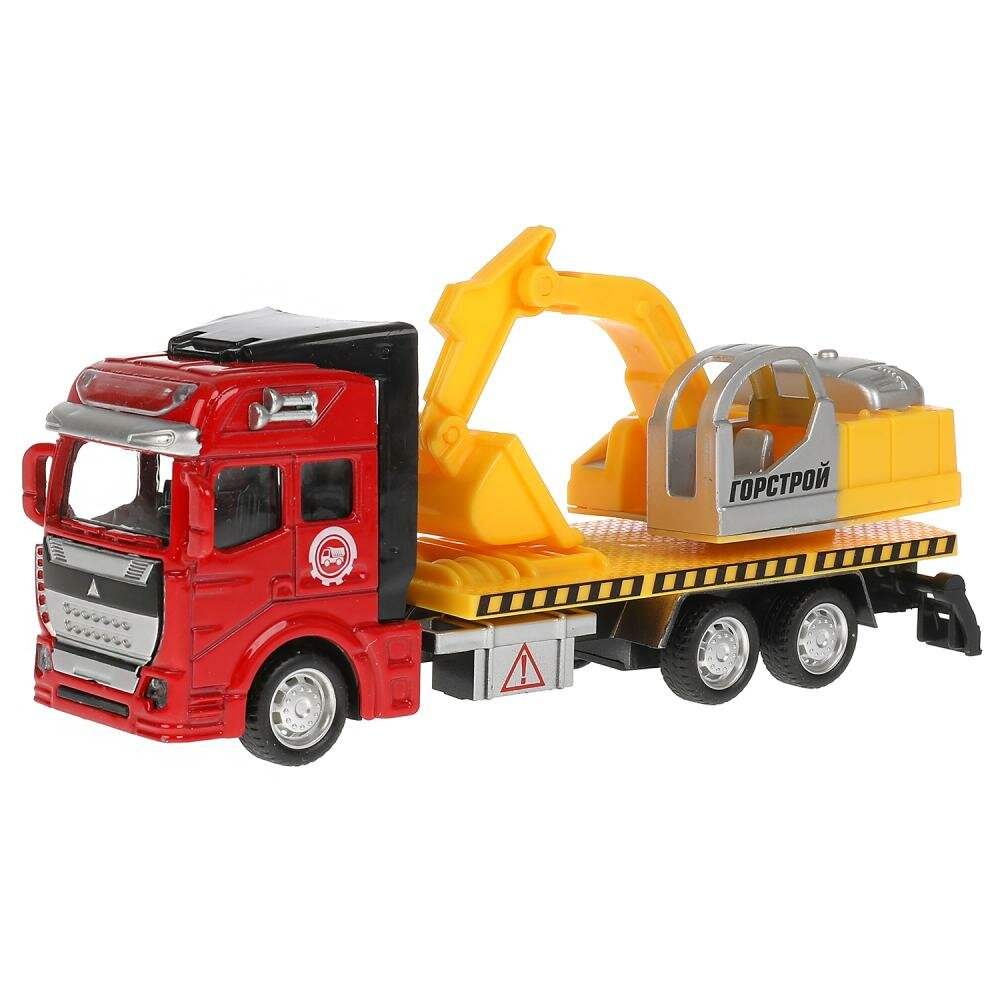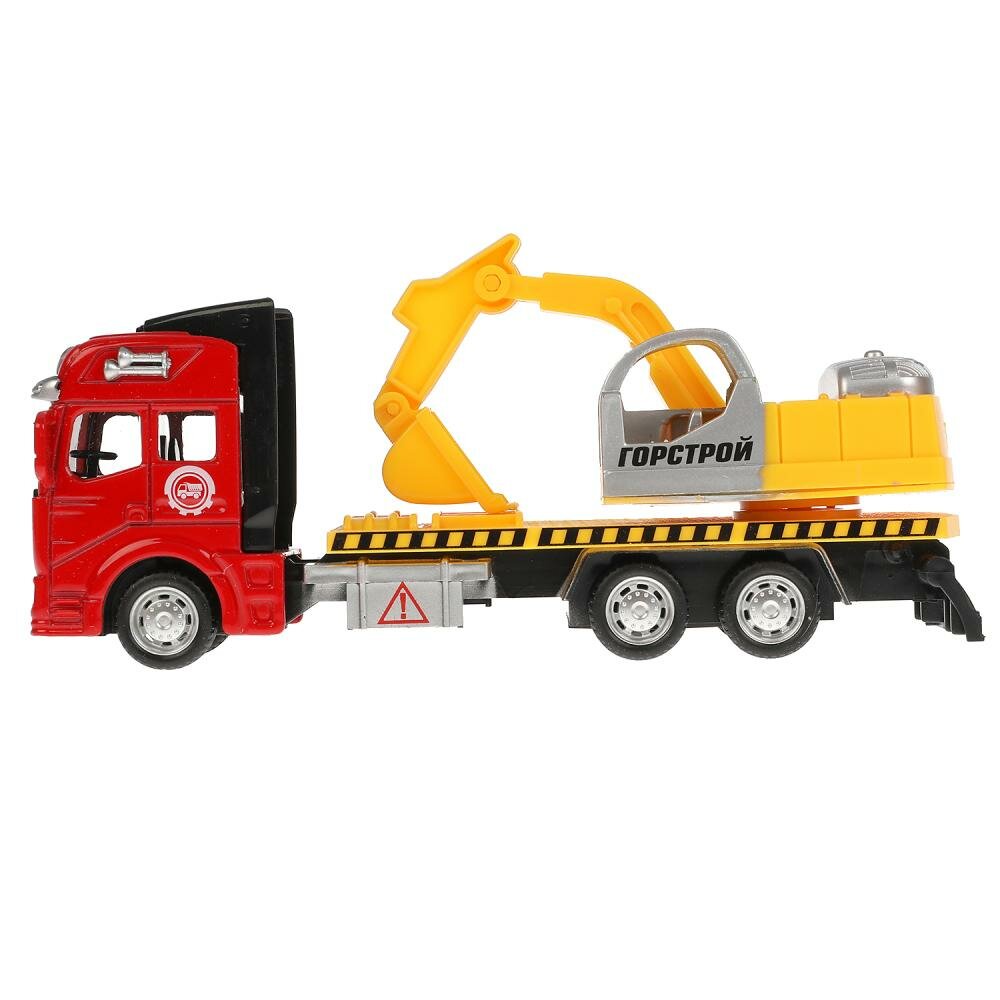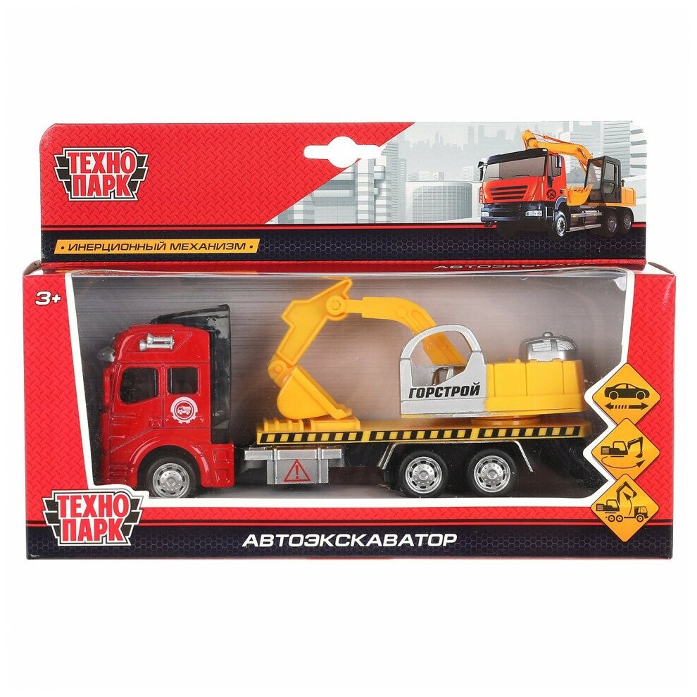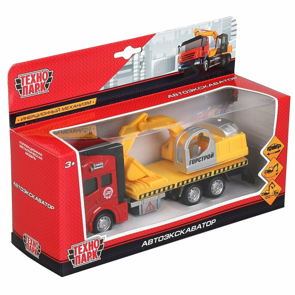 Металлическая машинка «АВТОЭКСКАВАТОР» является миниатюрной копией настоящей строительной техники. Игрушка сделана из прочного металла и пластмассы и окрашена в яркие цвета. Кабина выполнена в красном цвете, ярко-оранжевый кузов дополнен надписью «Горстрой». Длина машинки — 19 см. Имеются подвижные элементы: ковш поднимается и опускается, а также поворачивается вправо и влево. Экскаватор оснащён инерционным механизмом: если его оттянуть назад и отпустить, он поедет самостоятельно. Игрушка развивает мелкую моторику рук, воображение и расширяет кругозор ребёнка.