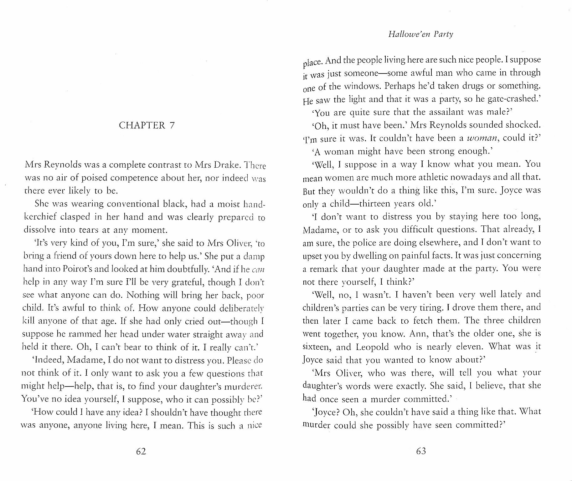 At a Hallowe'en party, Joyce - a hostile thirteen-year-old - boasts that she once witnessed a murder. When no one believes her, she storms off home. But within hours her body is found, still in the house, drowned in an apple-bobbing tub.