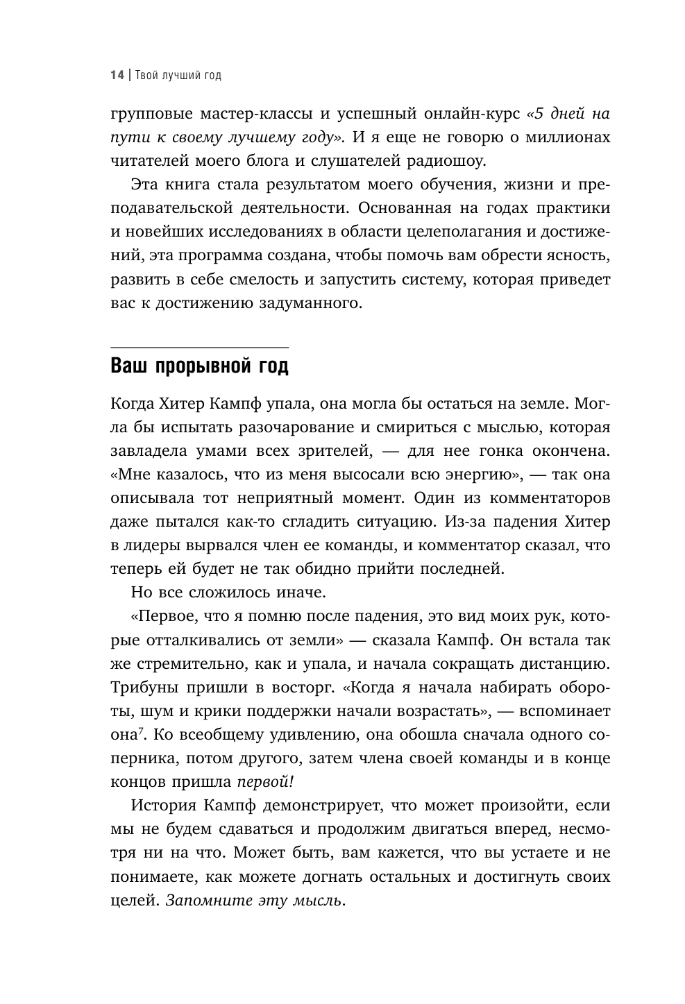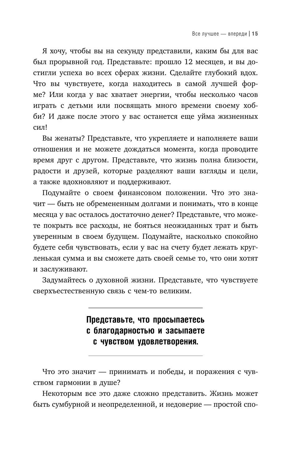 Этот год имеет все шансы стать лучшим в вашей жизни. Не важно, что вы завалены делами, что вес никак не придет в норму, что брак трещит по швам, и дети совершенно отбились от рук. Прошлое не определяет будущее, утверждает Майкл Хаятт. Его определяет только ваша решимость что-то изменить. Автор этой книги предлагает простую систему превращения следующих 12 месяцев в настоящий марафон, задача которого - избавиться от ограничивающих убеждений и научиться достигать больших целей. Тех, что превращают желаемую жизнь в реальную. Готовы приступить? Тогда поехали!