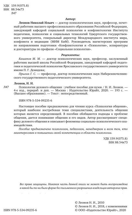 Психология делового общения. Учебное пособие (Николай Ильич Леонов); ЮРАЙТ, 2019