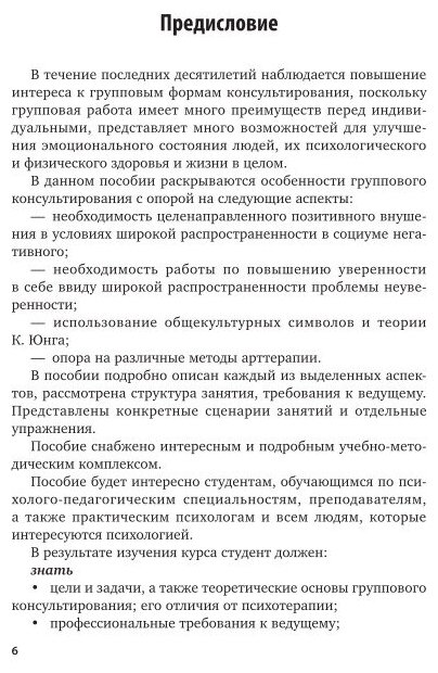 Настоящий учебник представляет собой обобщение многолетней практической деятельности автора с людьми разных возрастных групп и профессий. Особенность предлагаемого автором подхода — включение в процесс консультирования позитивного внушения, необходимого для сохранения здоровья и успешной жизни в целом, а также работу с символами, которая позволяет гармонизировать внутренний мир современного человека (К. Юнг). В книге представлены сценарии занятий и отдельные упражнения, содержащие различные методы арттерапии и игротерапии.
