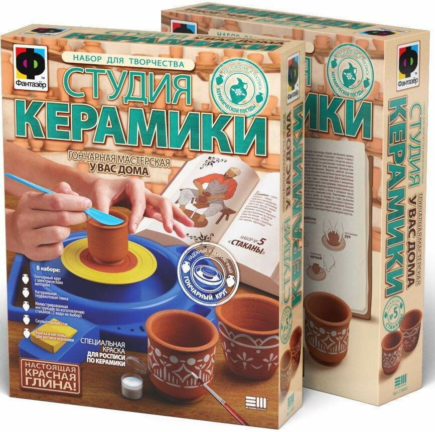 | Состав набора | гончарный круг с ножным приводом (работает на батарейках), натуральная красная гончарная глина, скульптурный стек, руководство по изготовлению двух видов стаканов |