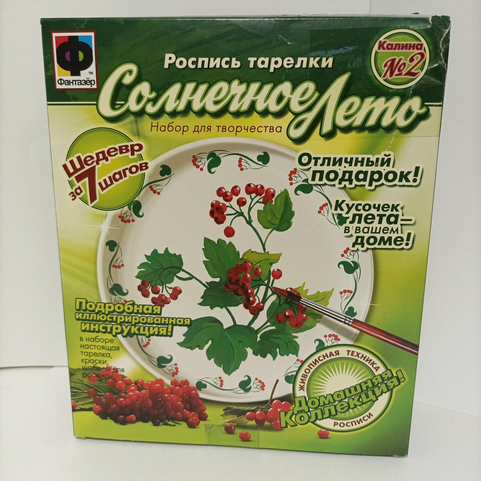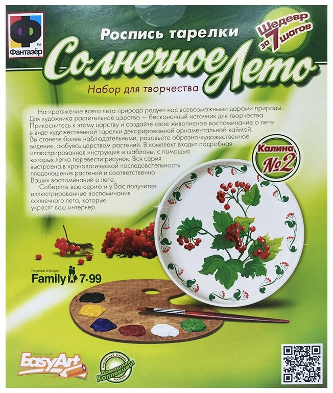 Красочный набор для творчества Калина из серии Солнечное лето от компании Фантазер - это расписная тарелка. Он состоит из тарелки красок и шаблона для росписи. Этот замечательный набор развивает воображение концентрацию внимания аккуратность развивает художественные наклонности. Когда тарелка будет расписана она может украсить дом а также будет напоминать о солнечном лете.