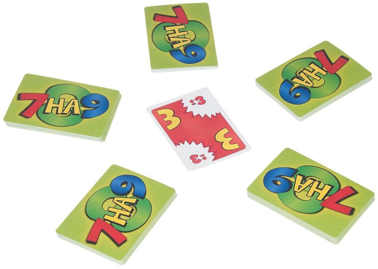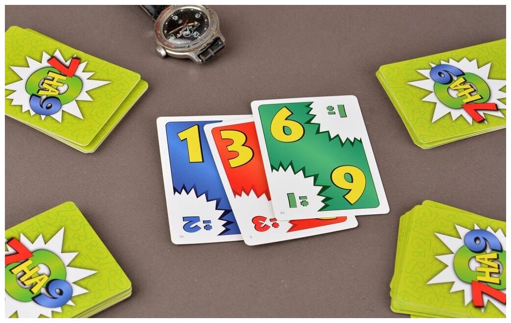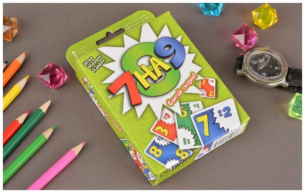 Локализация простой компанейской игры 7 ate 9. Игра очень ярко выделяется на фоне категории простых карточных игр тем, что в ней нет ходов - все действия идут в реальном времени по готовности игроков. Основная задача - избавиться от своих карт. На каждой карте есть число и модификатор, например, 7 плюс минус два. Соответветственно, сверху на эту карту можно класть либо девятку, либо пятёрку. Новая карта также будет иметь модификатор. Таким образом получается постоянная цепочка из карт, которыми можно продолжать стопку. В игре используются карты номиналом от 1 до 10. По дополнительным правилам можно вычитать из единицы или прибавлять к десятке: например, 10+3=3 (13-10=3 - отбрасываем десятку), а 2-3=9 (добавляем десятку к первому числу: 12-3=9). Игра выпускается в компактном дорожном издании.