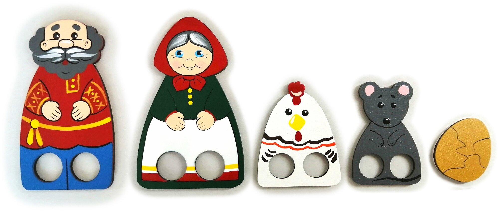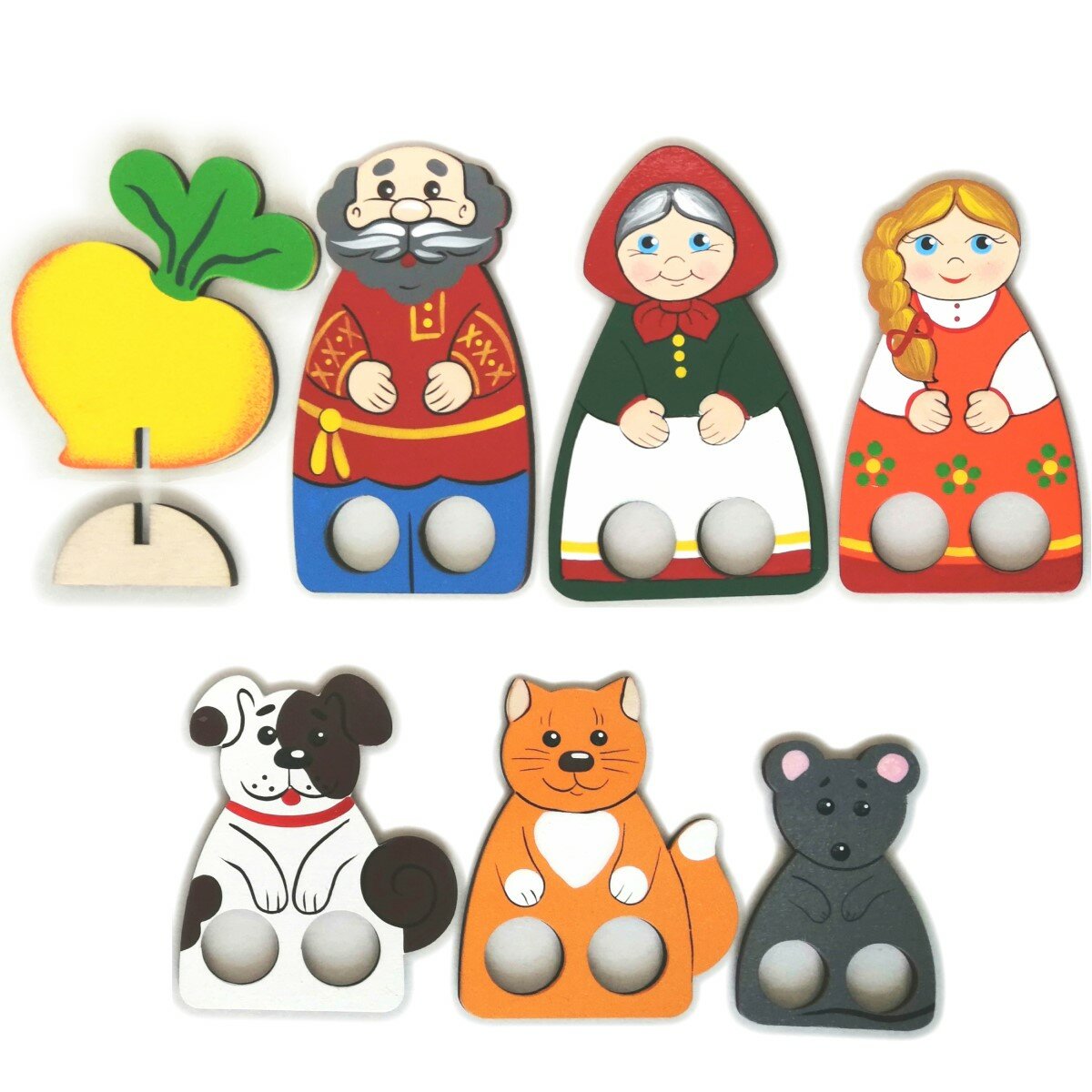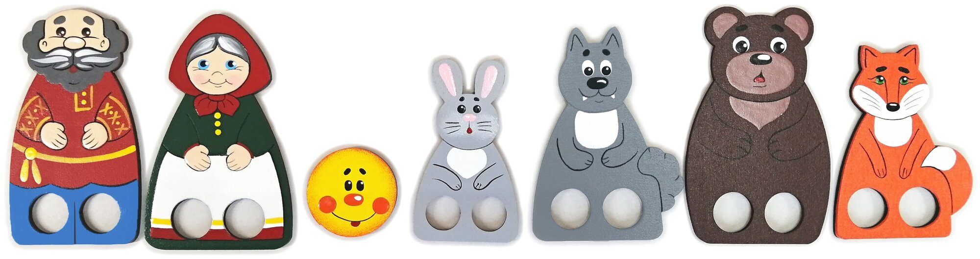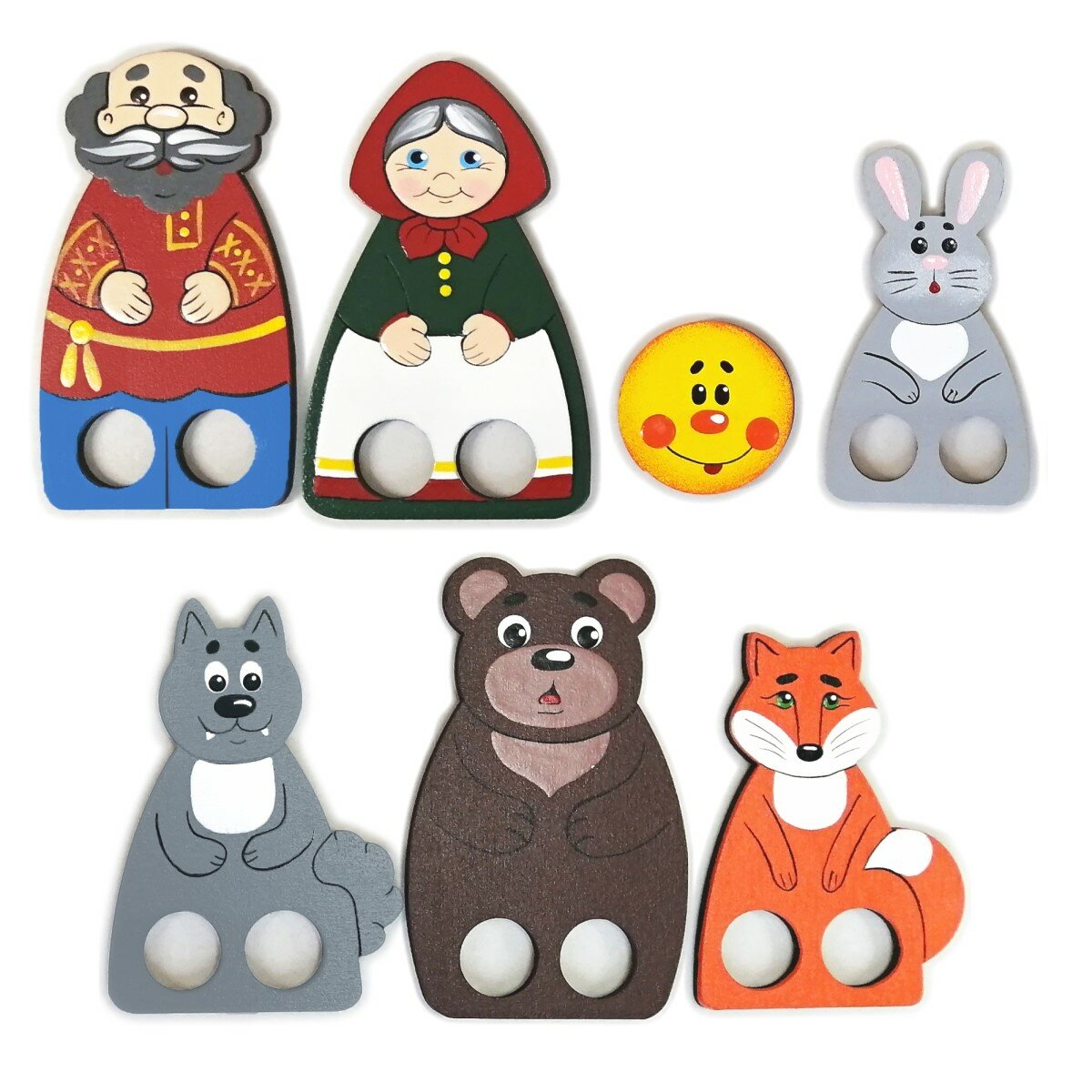 В наборе 12 фигурок, сквозь которые просовывают два пальчика и получаются ножки или лапки. А также теремок, репка, яичко и три подставки. С одной стороны яичко золотое, с другой белое. Предметы можно использовать для постановки сказок: Колобок, Теремок, Репка, Курочка Ряба, Лиса и заяц и т.д.