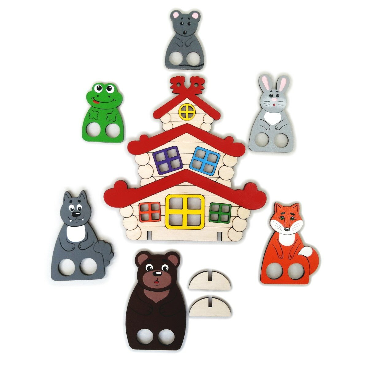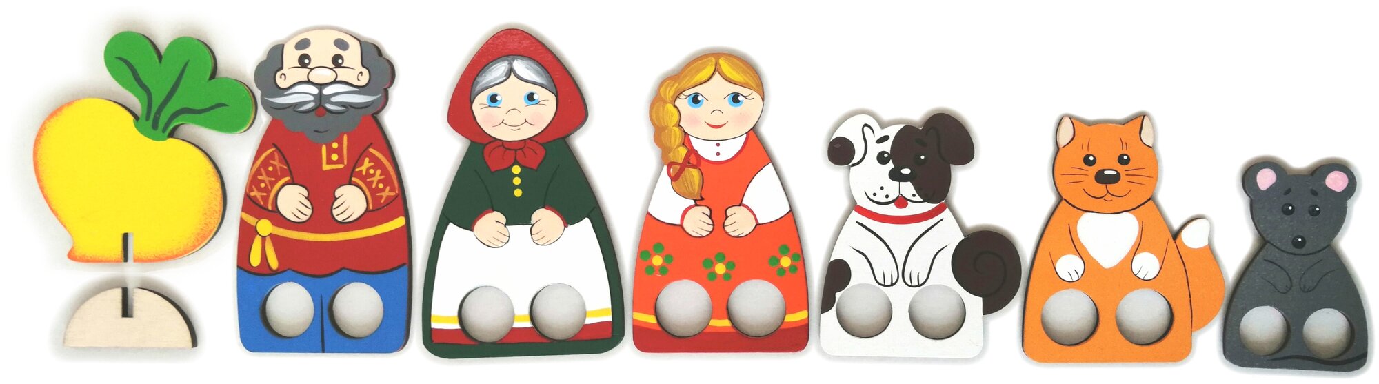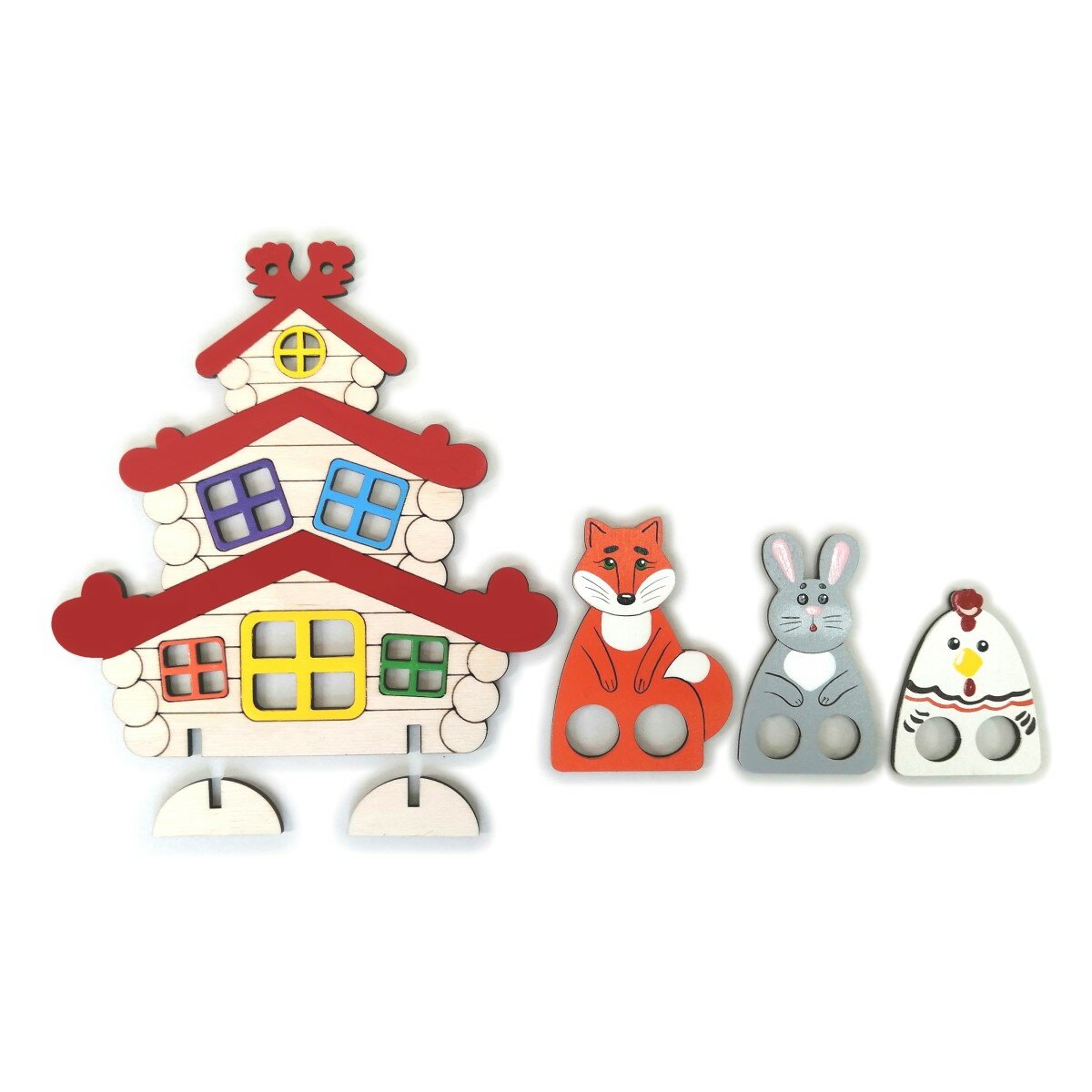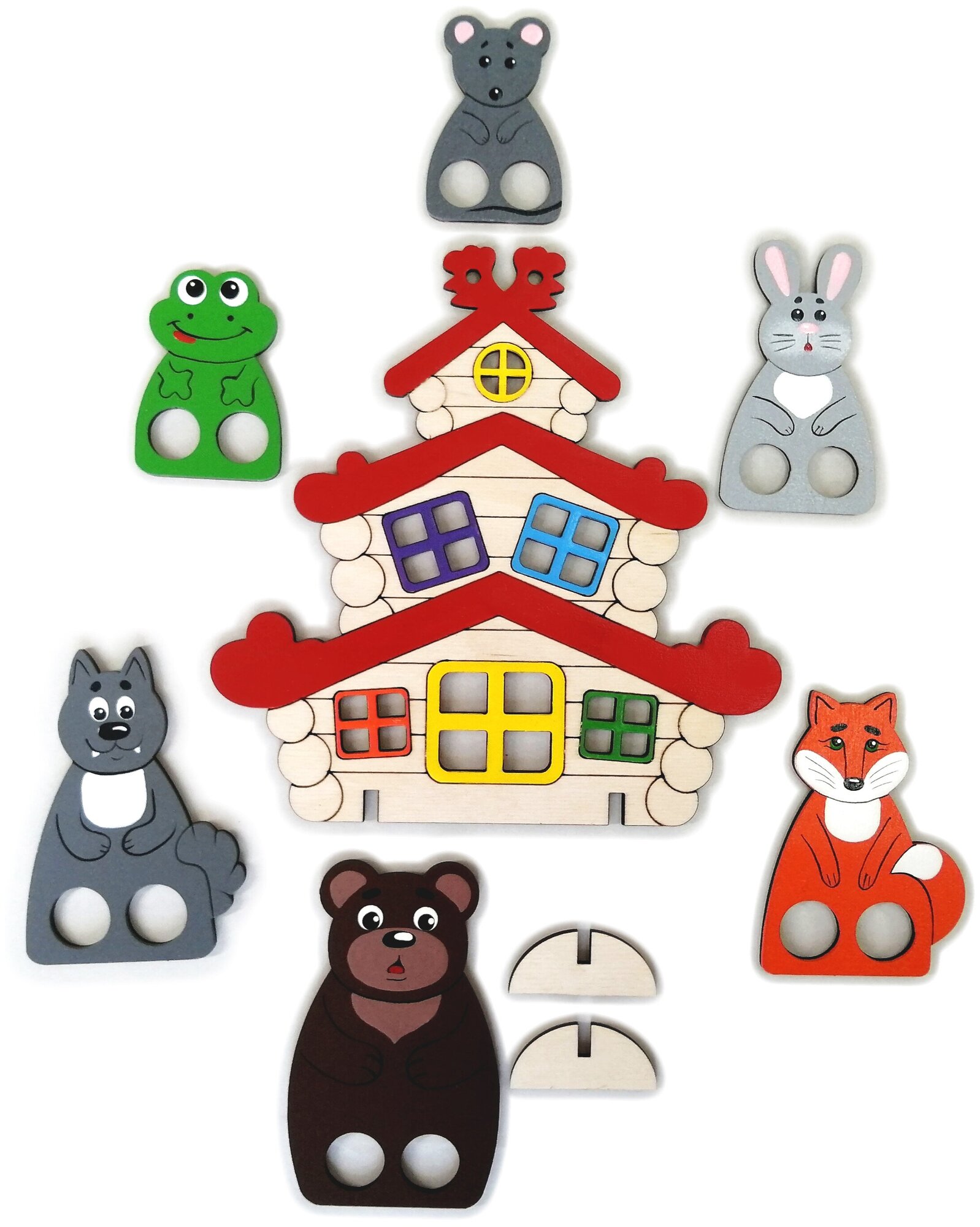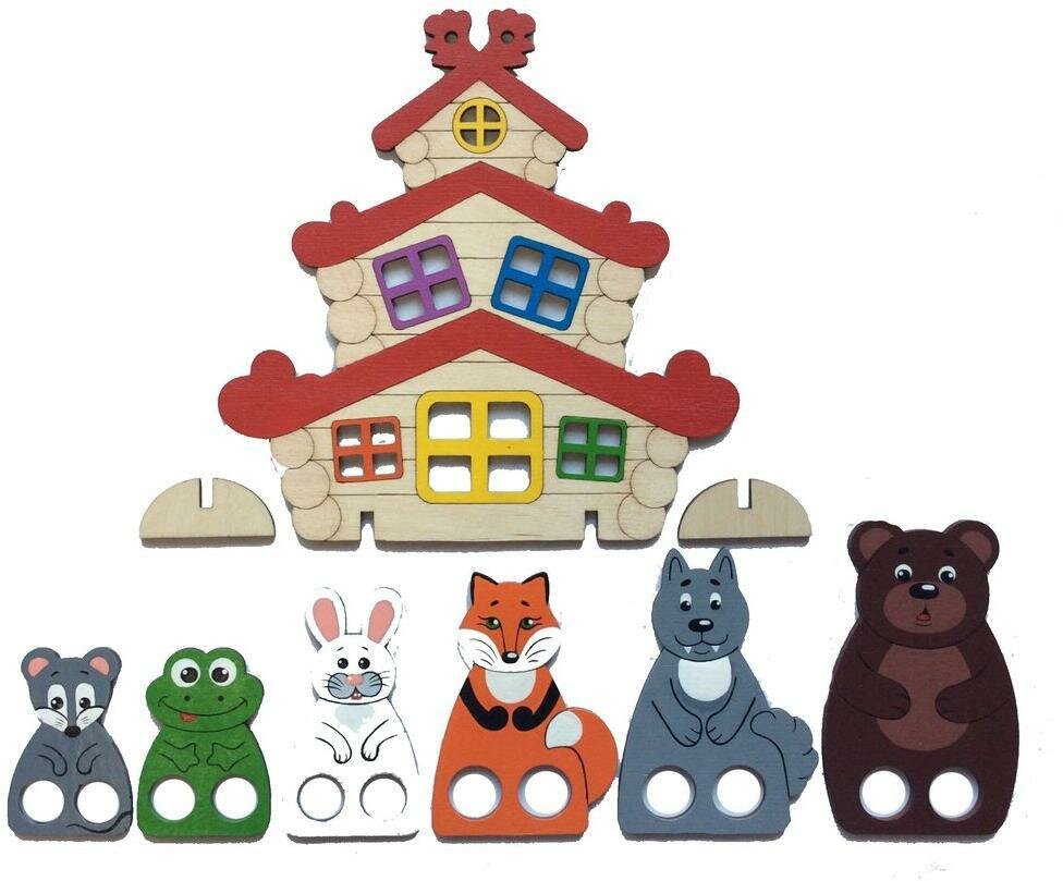 - Размеры фигурок: теремок: 18x18 см, самые большие фигуры (медведь, дед, бабка): 11 см, самые маленькие фигуры (лягушка, мышь, курица): 6 см.
