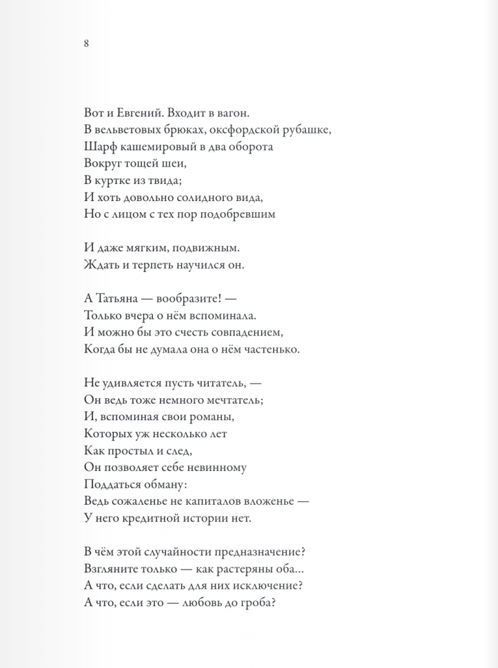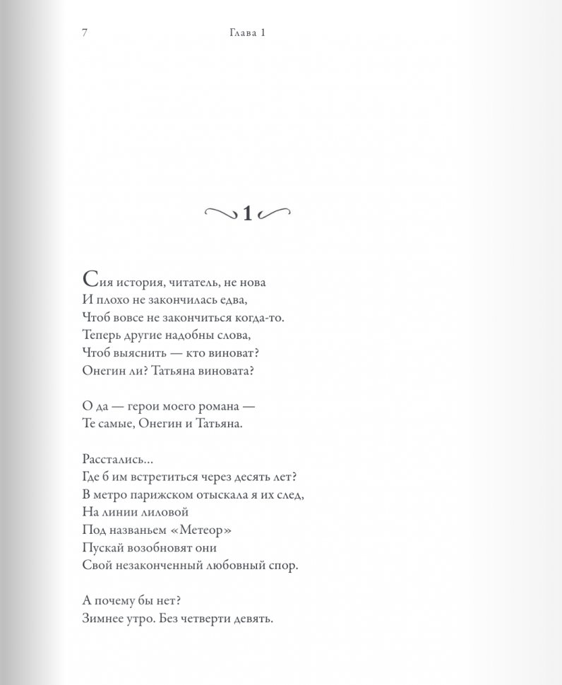 Упоительная любовная история сегодняшних Евгения и Татьяны - современная и вечная, роман в стихах француженки Клементины Бове, звучащий как речитатив, тронул бы и Пушкина с Чайковским, чьи произведения и герои вдохновляли автора.