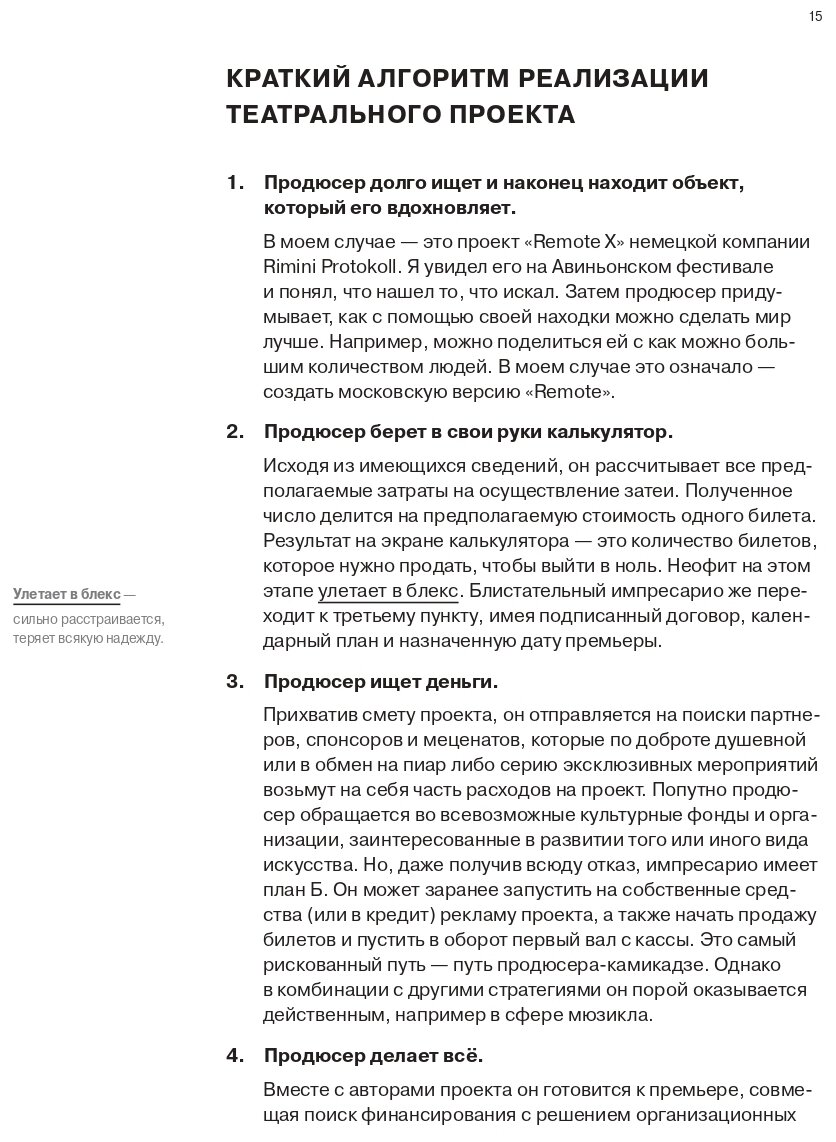 Однажды Фёдор Елютин совершил очень странный поступок. Не имея ни рубля инвестиций, он привёз в Москву экспериментальный спектакль из Германии. Отправив тысячи москвичей в уникальное аудиопутешествие "Remote Moscow", он неожиданно запустил волну иммерсивного театра в России. Сейчас в репертуаре компании Елютина с десяток проектов, и каждый приносит значительную прибыль, что в театральном деле считается невозможным по определению. Как у него это получилось? Какие принципы и правила привели его к успеху? В попытке ответить на этот вопрос Импресарио написал книгу-спектакль, которая вдохновит всех, кто готов ставить перед собой амбициозные цели и идти до конца за своей мечтой.