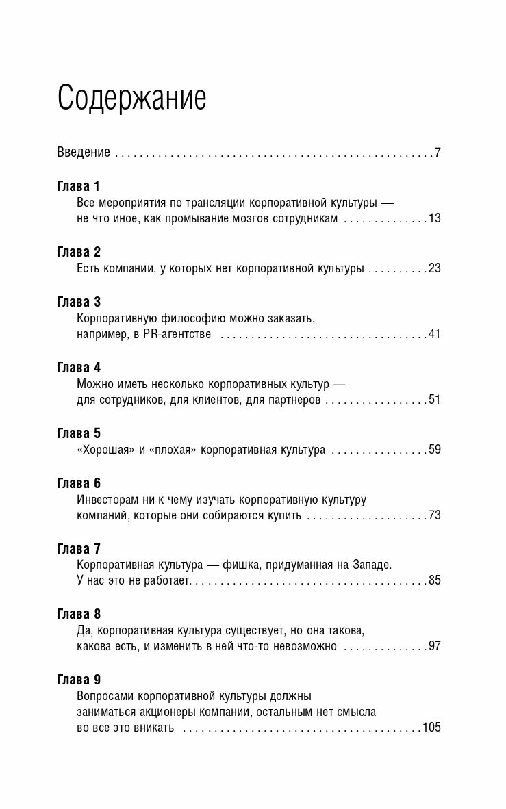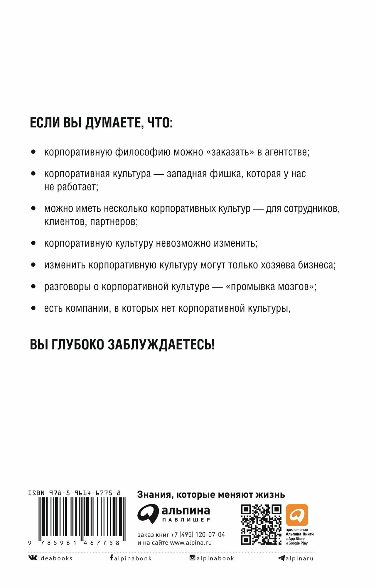Что такое корпоративная культура? Почему руководство должно активно участвовать в ее создании? Почему не работают навязанные со стороны стандарты? На примерах из жизни российских компаний автор показывает, как корпоративная культура помогает поднять мотивацию, наладить взаимодействие отделов и нацелить всех на общий результат. По поводу корпоративной культуры бытует много заблуждений, самые опасные из которых детально разобраны в этой книге. Книга в первую очередь адресована владельцам и топ-менеджерам компаний, т. е. тем, кто формирует корпоративную культуру организации. Также издание будет интересно оргконсультантам и студентам.