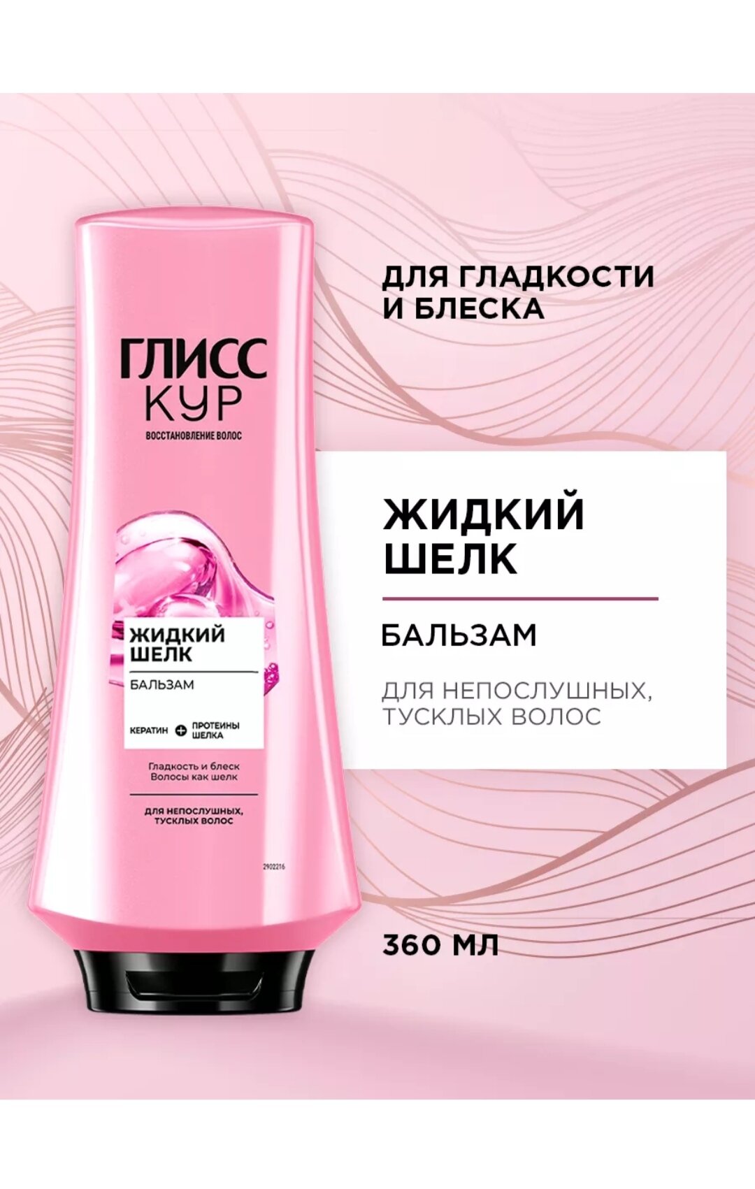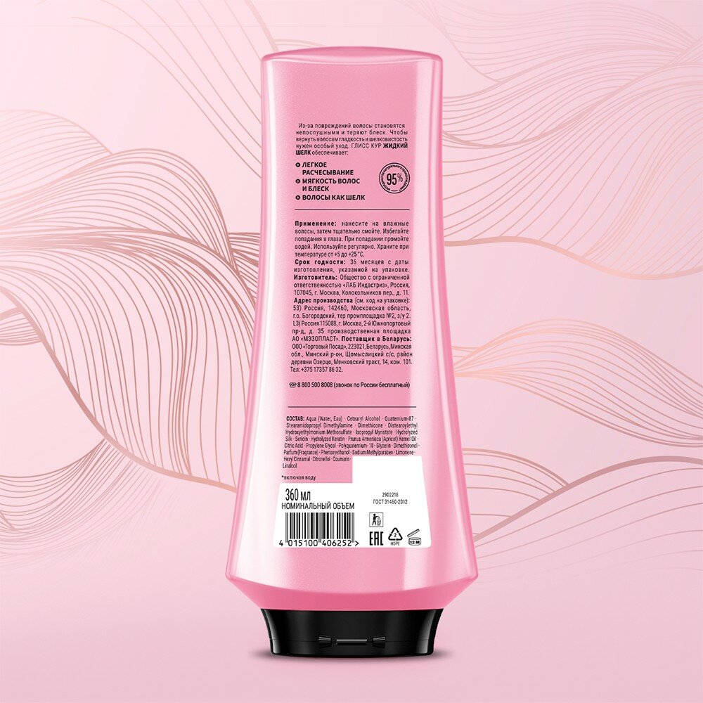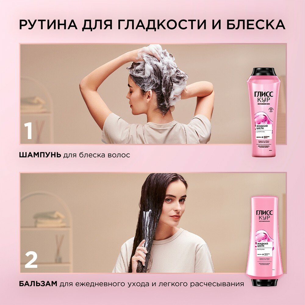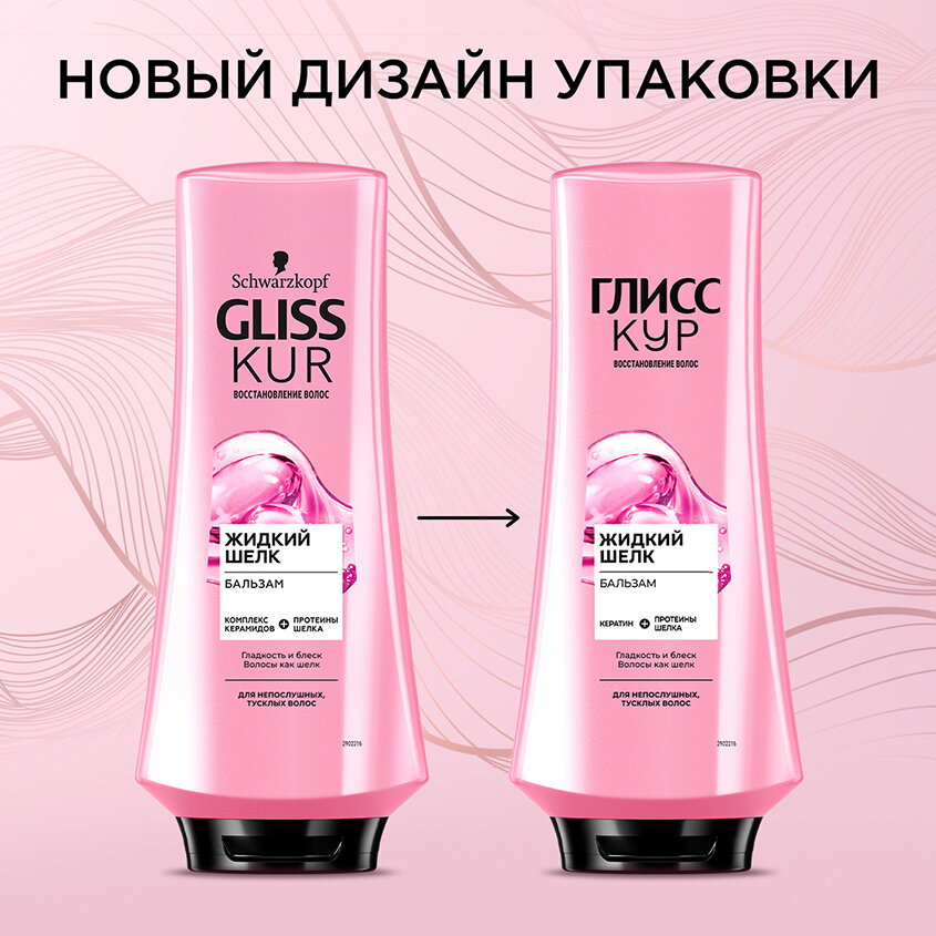 Бальзам GLISS KUR "Жидкий шелк" для ломких и лишенных блеска волос, содержит специальный набор активных ингредиентов с компонентами нутри-шелка в жидком виде, придающих волосам дополнительный блеск. Ваши волосы приобретают ослепительный блеск и гладкость, как шелк.