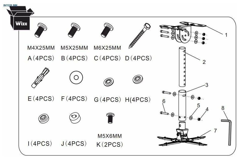 Универсальный потолочный комплект Wize WPB-S, состоящий из крепления, штанги 43-64 см и площадки к потолку для проектора. Функции наклона +/-15° и поворота +/-15° позволяют установить оптимальный угол обзора. Возможность вращения на 180⁰ делает просмотр максимально комфортным. Комплект выдерживает нагрузку до 12 кг.