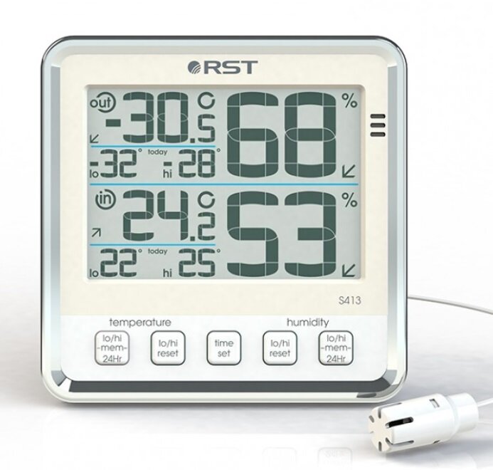 RST - это термогигрометр, который самым точным образом измерит температуру воздуха и влажность. Причем, температуру он способен измерять даже вне помещения. Следует отметить, что устройство способно фиксировать максимальные и минимальные температурные значения. Четкий дисплей отразит всю необходимую информацию. Прибор также имеет возможность индикации тенденции изменения показателей, что очень удобно. Более того, прибор даже сможет предупредить о заморозках.