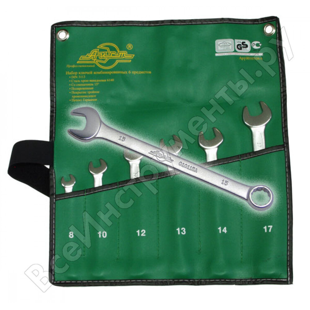 Профессиональный набор рожково-накидных гаечных ключей размером от 8 до 17 мм 6 шт. используется для работы с резьбовыми соединениями указанного размера. Применяется в сфере ремонта различной техники. Подойдет для использования, как набор гаечных ключей для автомобиля.С одной стороны ключи имеют рожковый профиль, а с другой двенадцатигранный накидной. Использование двух одноразмерных профилей делает инструмент универсальным для работы с крепежом.Комплект комбинированных ключей выполнен из хромванадиевой стали (CR-V), что говорит о долгом сроке службы инструмента, а хромоникелевое покрытие увеличивает стойкость к коррозии.Набор гаечных комбинированных ключей поставляется в чехле-скрутке, обеспечивая компактное хранение и сохранность инструмента. Наличие отверстий в чехле позволяет хранить набор гаечных ключей в подвешенном состоянии.Материалы и технологический процесс изготовления:- сталь: кованная Cr-V6140;- обработка: закалка ТВЧ, полирование;- покрытие: тройное хромо-никелевое;- твердость: 45-48 HRC;- стандарт: DIN3113.Конфигурация:- динамический профиль накидной части;- с отгибом 15°, американский тип.Комплектация:- Ключ комбинированный: 8, 10, 12, 13, 14, 17 мм.Прочее:- в сумке конверте ПВХ с латексом, морозоустойчивом.