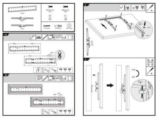 - Крепкий, достаточно не сложен в установке, универсальный (подходит для разных размеров телевизоров), винты и шурупы в комплекте, есть регулировка наклона относительно стены (т.н. функция "Антиблик").