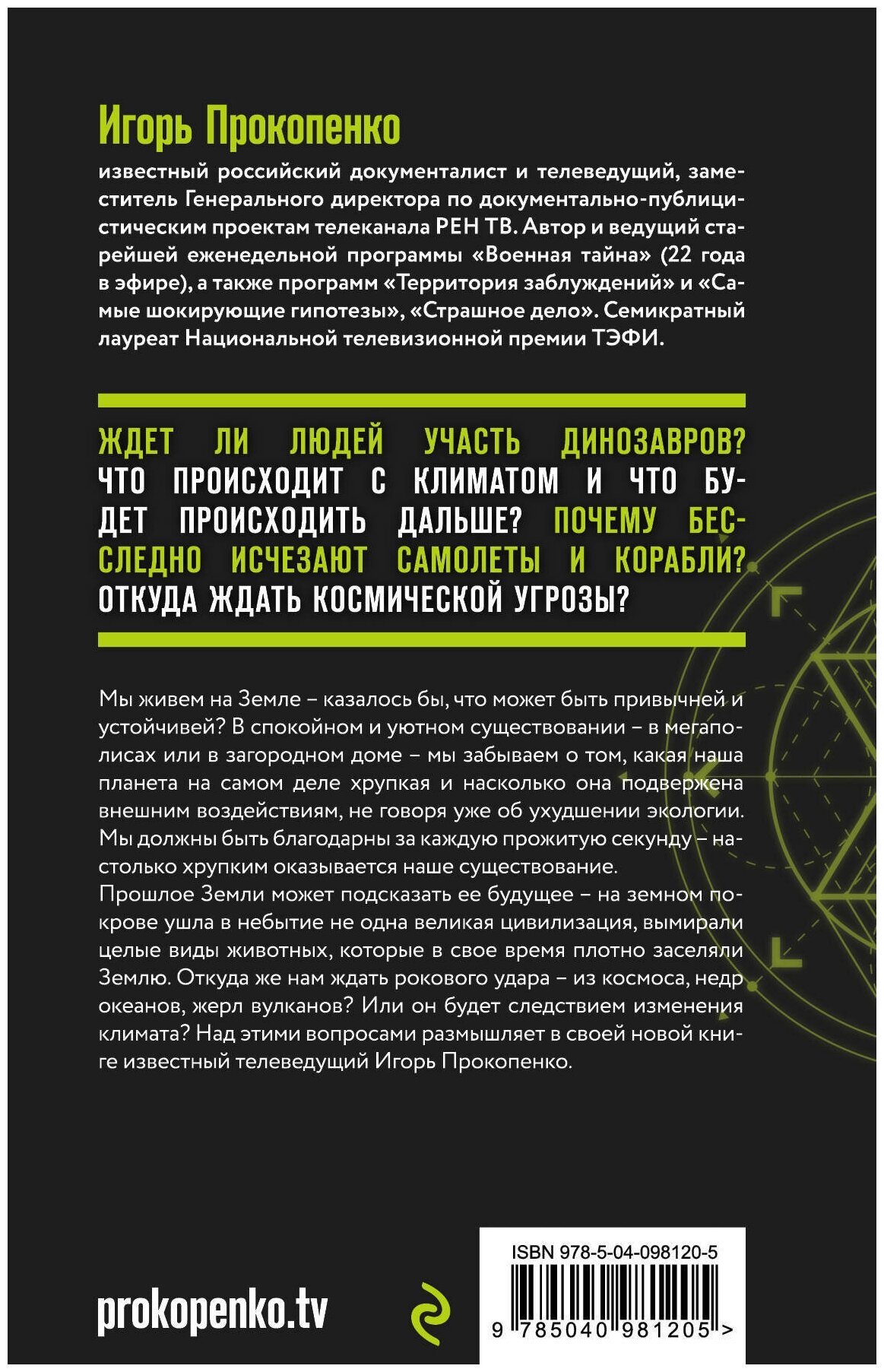 Мы живем на Земле - казалось бы, что может быть привычней и устойчивей? В спокойном и уютном существовании - в мегаполисах или в загородном доме - мы забываем о том, какая наша планета на самом деле хрупкая и насколько она подвержена внешним воздействиям, не говоря уже об ухудшении экологии. Мы должны быть благодарны за каждую прожитую секунду - настолько хрупким оказывается наше существование. Прошлое Земли может подсказать ее будущее - на земном покрове ушла в небытие не одна великая цивилизация, вымирали целые виды животных, которые в свое время плотно заселяли Землю. Откуда же нам ждать рокового удара - из космоса, недр океанов, жерл вулканов? Или он будет следствием изменения климата? Над этими вопросами размышляет в своей новой книге известный телеведущий Игорь Прокопенко.