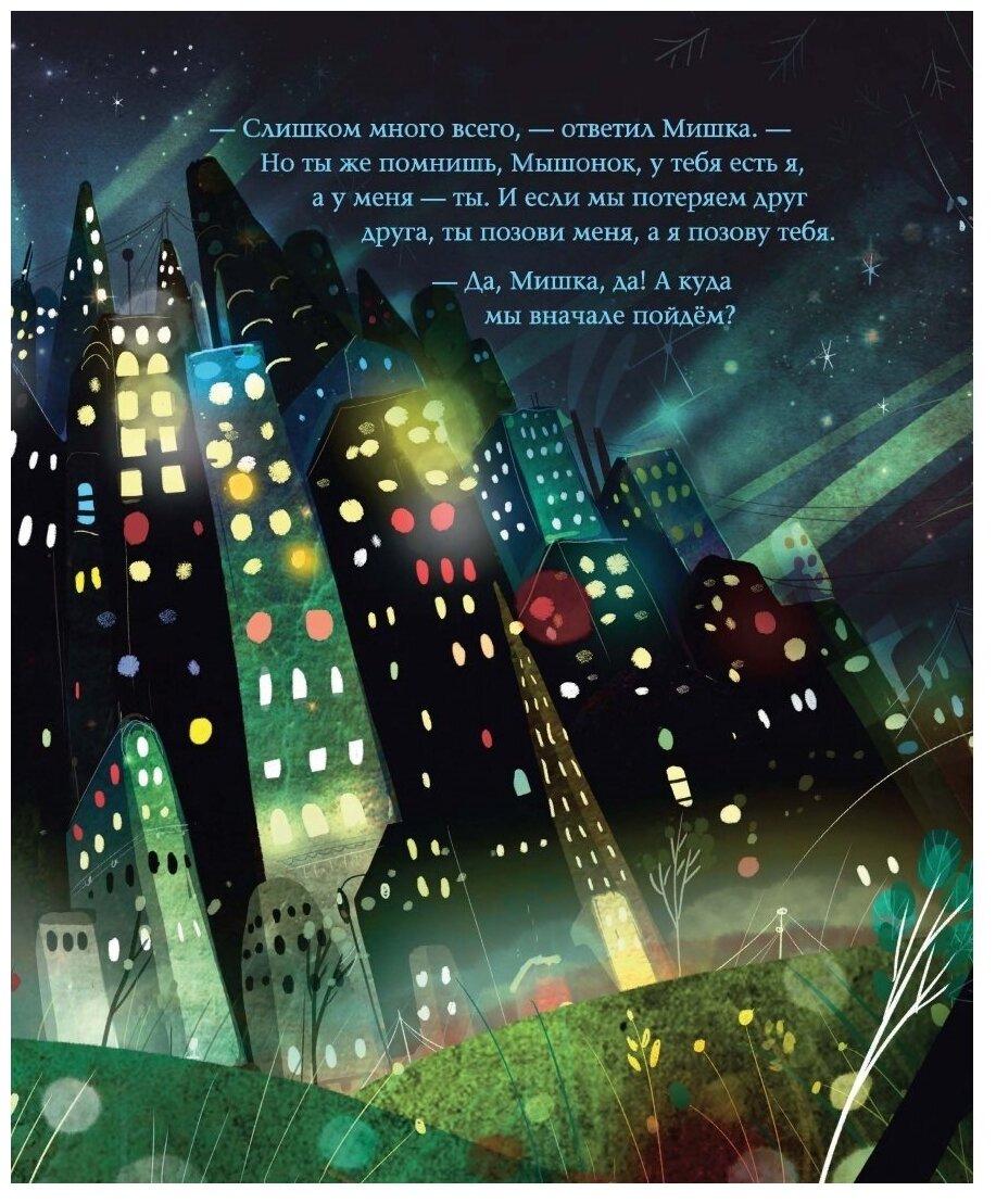 Впрочем, мышонку и этого оказалось мало, он хотел ещё больше огней и ещё больше блеска. И вот, поднявшись на самый высокий и самый яркий городской небоскрёб, Мышонок оказался… в настоящей мышеловке! Но Мишка не даст своего друга в обиду, а Мышонок помнит, что чтобы ни случилось, ему нужно только позвать своего спасителя.