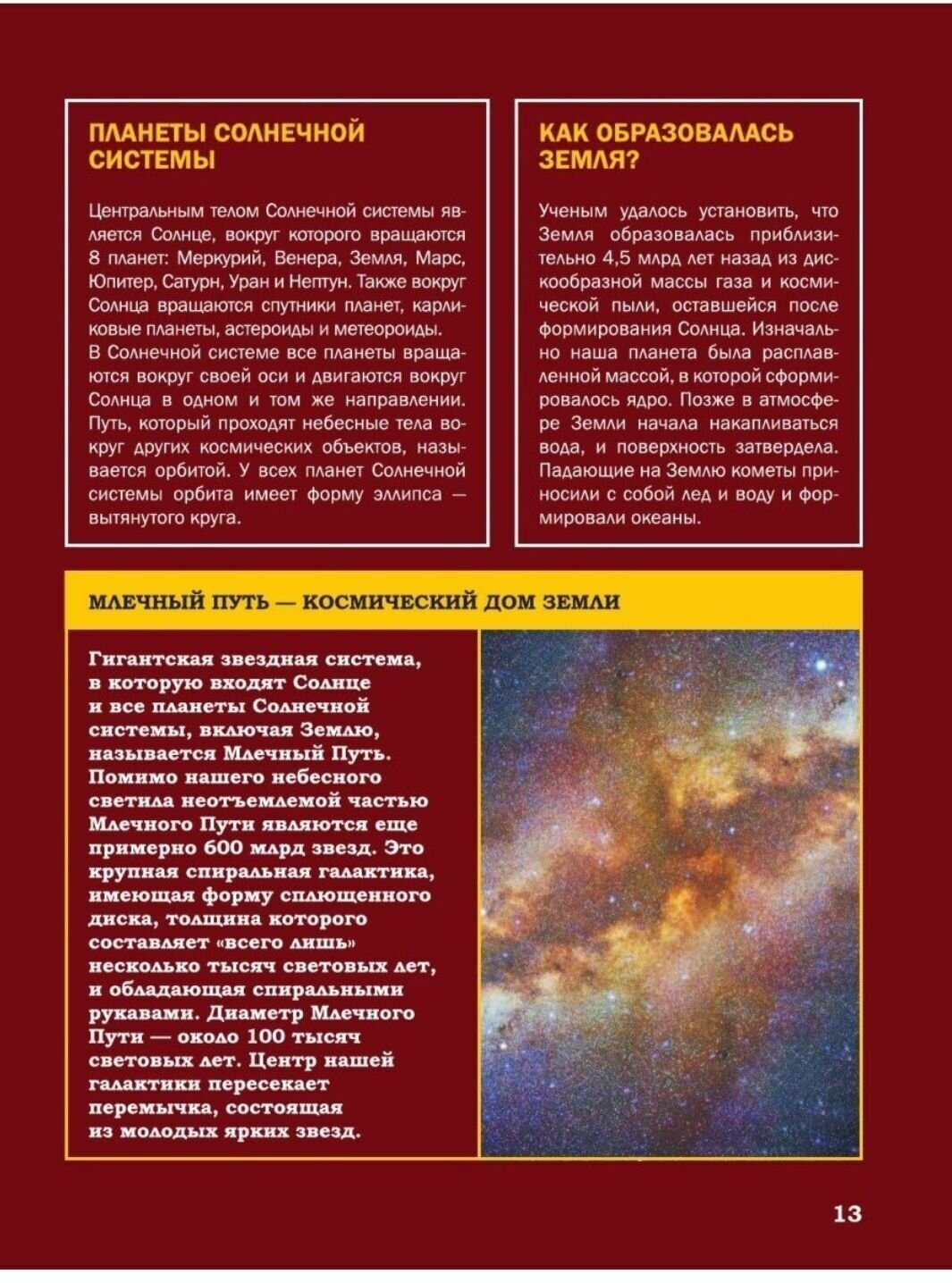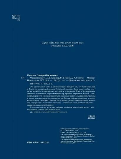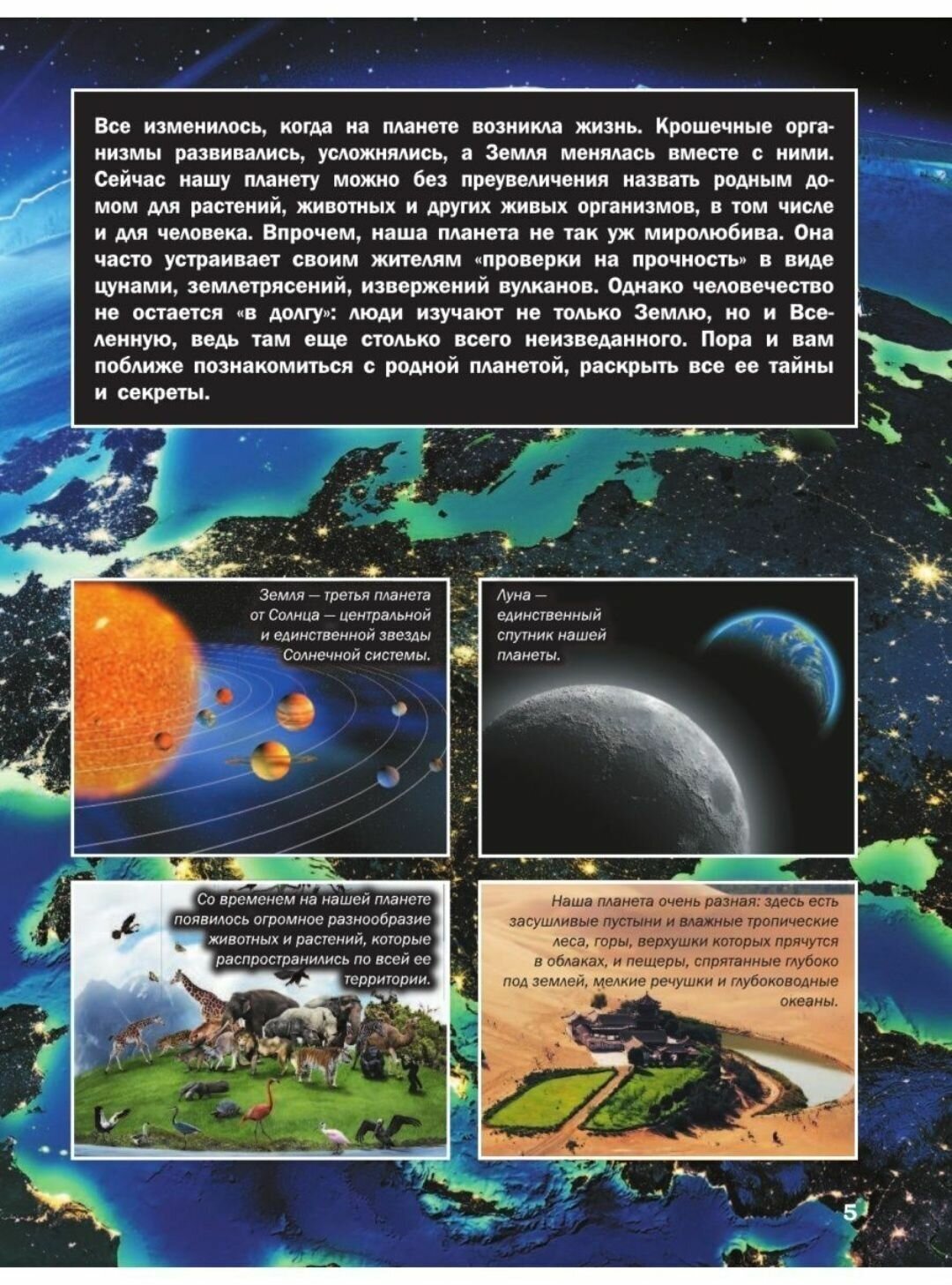 Эта удивительная книга с ярким постером порадует тех, кто хочет знать все о Земле как уникальной планете Солнечной системы. Здесь можно найти ответы на вопросы о возникновении ее самой и ее спутника Луны, о формировании океанов и континентов, о происхождении гор и равнин, джунглей и пустынь. Занимательные тексты, описывающие цунами и вызывающие их землетрясения, ураганы и ливни, а также страны, где происходят необычные природные явления, и людей, которые строят свои города в непростых условиях, увлекут любознательных читателей. Информация о растениях и животных - обитателях лесов, полей, морей и рек - также вызовет немалый интерес.