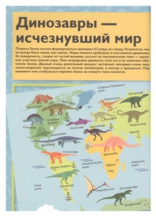 Перед тобой очень познавательная энциклопедия, ведь здесь содержится исчерпывающая информация о динозаврах: как они выглядели, чем питались, где жили, почему исчезли. В книге приводится классификация древних ящеров в зависимости от строения скелета и внешних признаков, на страницах издания отражены и места расселения этих удивительных рептилий. Когда-то Земля была единой и динозавры жили повсюду, но в наши дни исследователи находят их останки на конкретных территориях, чаще всего в Северной Америке и Азии. Наглядные карты и систематизированная информация позволяет понять, какие палеонтологические тайны хранит каждый континент. Красочные иллюстрации доисторических ящеров среди экзотическрой растительности создадут эффект полного присутствия в их далекой эпохе. Энциклопедия поможет составить разностороннюю картину жизни динозавров и, возможно, в будущем стать исследователем древних миров.