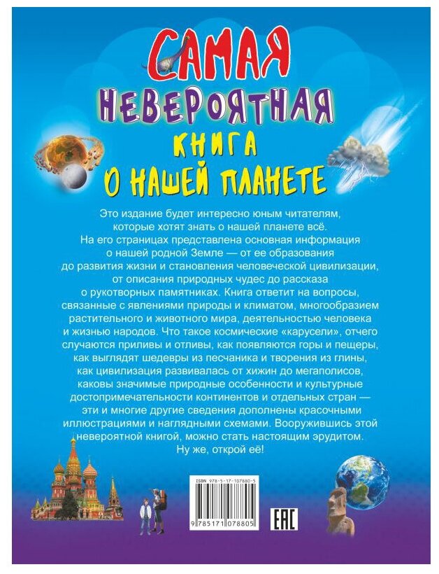 Почему эта книга невероятная? Да потому что благодаря ей можно узнать все на свете о нашей планете: от Большого взрыва и образования материи до появления человека и развития цивилизации, от особенностей народов и рас до характеристик стран и континентов, от описания природных чудес до рассказа о рукотворных памятниках. На страницах издания лаконичная интересная информация дополнена красочными иллюстрациями и наглядными схемами. Познавательность, доступность и прекрасное содержание книги позволят с пользой провести досуг. Каждый любознательный ребенок и даже взрослый обязательно сделают для себя множество открытий, стоит им только перевернуть страницу!