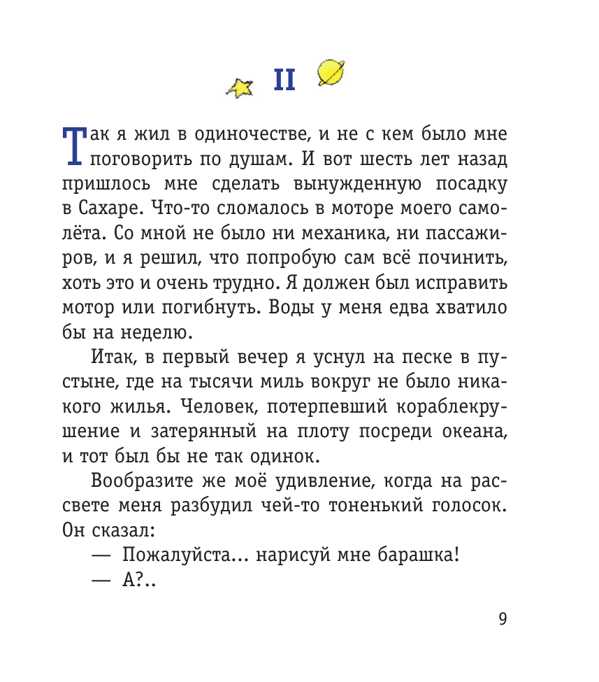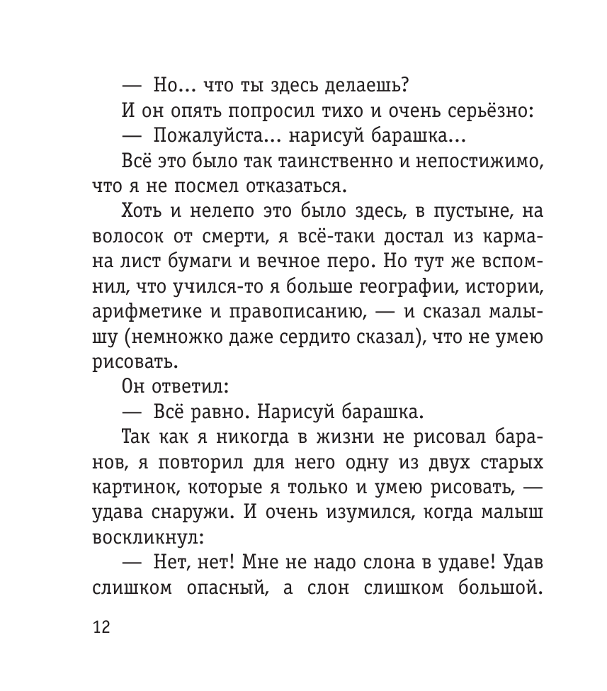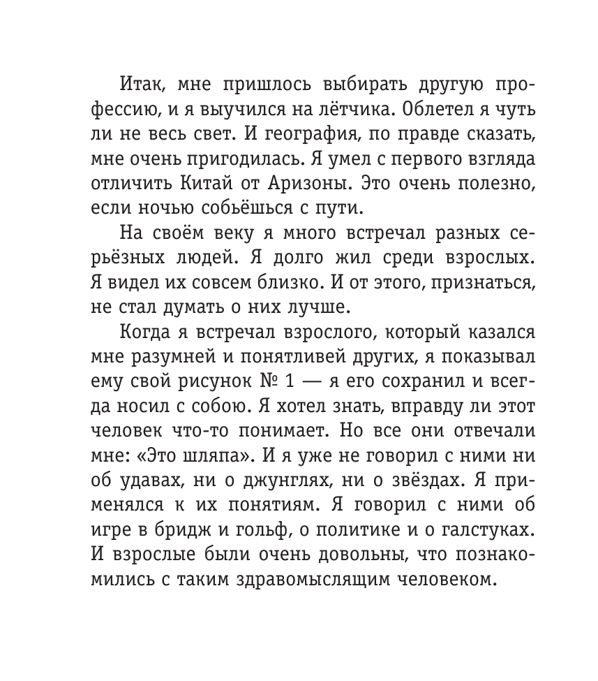 Эту книгу можно читать в любом возрасте и любое количество раз, открывая для себя что-то новое. Самое известное произведение Антуана де Сент-Экзюпери - это мудрая философская причта о самом важном: о любви, верности, красоте, понимании. Экзюпери написал её для тех, кто способен понять, что "самого главного глазами не увидишь - зорко одно лишь сердце". Рисунки в книге выполнены самим автором и не менее знамениты, чем сама книга. Они уникальны и понятны каждому. Эта книга для всех и на все времена.