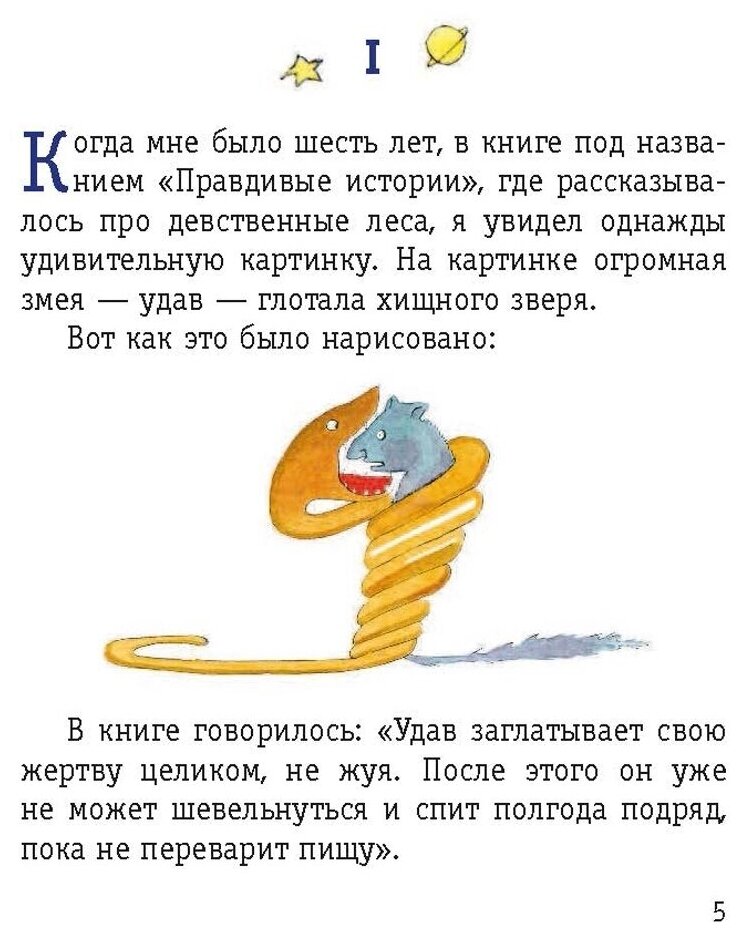 Обратите внимание на размер книги! Она совсем небольшого формата квадратная с яркой красивой обложкой. Листы плотные, шрифт хороший, иллюстрации цветные. Маленький принц на мой взгляд совсем не детское произведение и я не разделяю энтузиазма родителей, которые читают эту книгу совсем маленьким детям. Но во взрослом возрасте её надо прочитать обязательно, мудрая вещь!