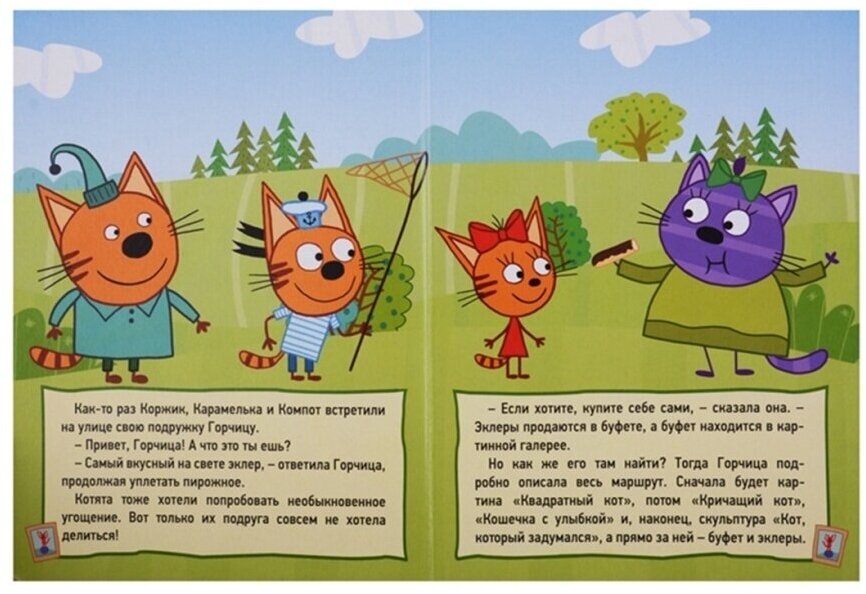 Отличная книга! Сыну 2 года, очень любит мультик, поэтому купила эту книжку, и сын в восторге! Часто ее берет, перелистывает, в ней 10 картонных страниц, поэтому ребенок не помнет, все красочные. В книге 4 разворота - все красочные. Есть интересный текст крупным шрифтом, где описывается как котики гуляют, смотрят картины, выбирают эклеры, рисуют картины. В книги есть все коты из мультфильма, не только Карамелька, Коржик и Компот