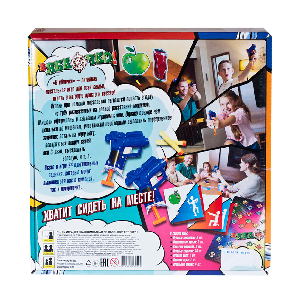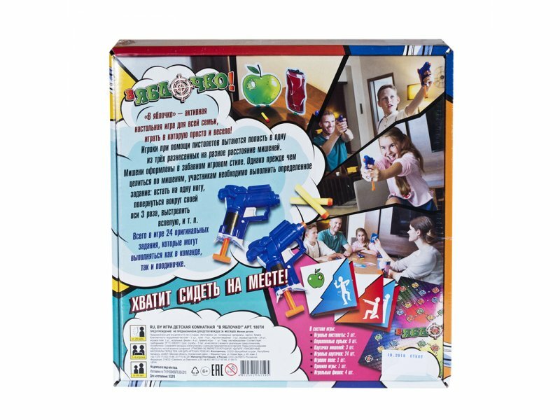 | Описание | «В Яблочко!» от DreamMakers- простая и активная настольная игра для всей семьи.,,Игроки при помощи пистолетов пытаются попасть в одну из трёх, разнесенных на разное расстояние, мишеней. Но прежде чем это сделать, участникам необходимо выполнить определенное задание:встать на одну ногу, повернуться вокруг своей оси 3 раза, выстрелить не глядя и т.д.,,Всего в игре 24 оригинальных задания, которые имеют как командный, так и одиночный режим.,,Игра рассчитана на 3-4 игроков |