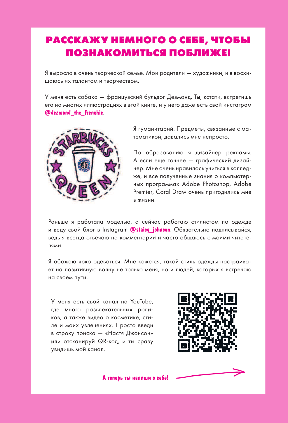 Книжка советов и лайфхаков от блоггера Насти Джонсон, особенно понравится девочкам- подросткам 15-18 лет. Дневничок хорошо оформлен, в нем есть место для записей, списков, целей на неделю, год...