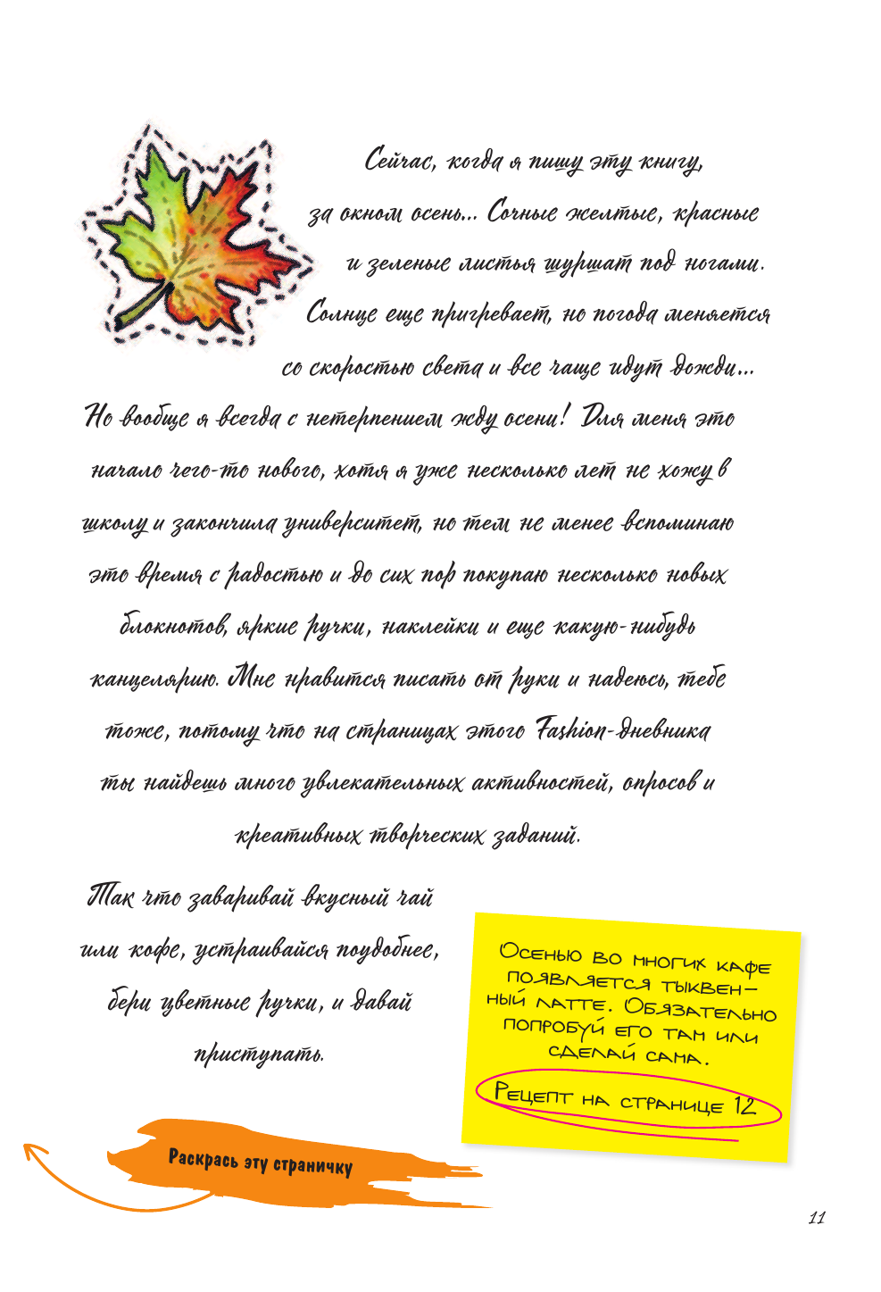 Проведи душевный осенний вечер за чашечкой ароматного чая, читая стильные советы. Возьми дневник с собой в зимнее путешествие. Встречай весну, выполняя интерактивные задания. Слушай летний шум ветра, наполняя fashion-раскраски самыми трендовыми цветами.