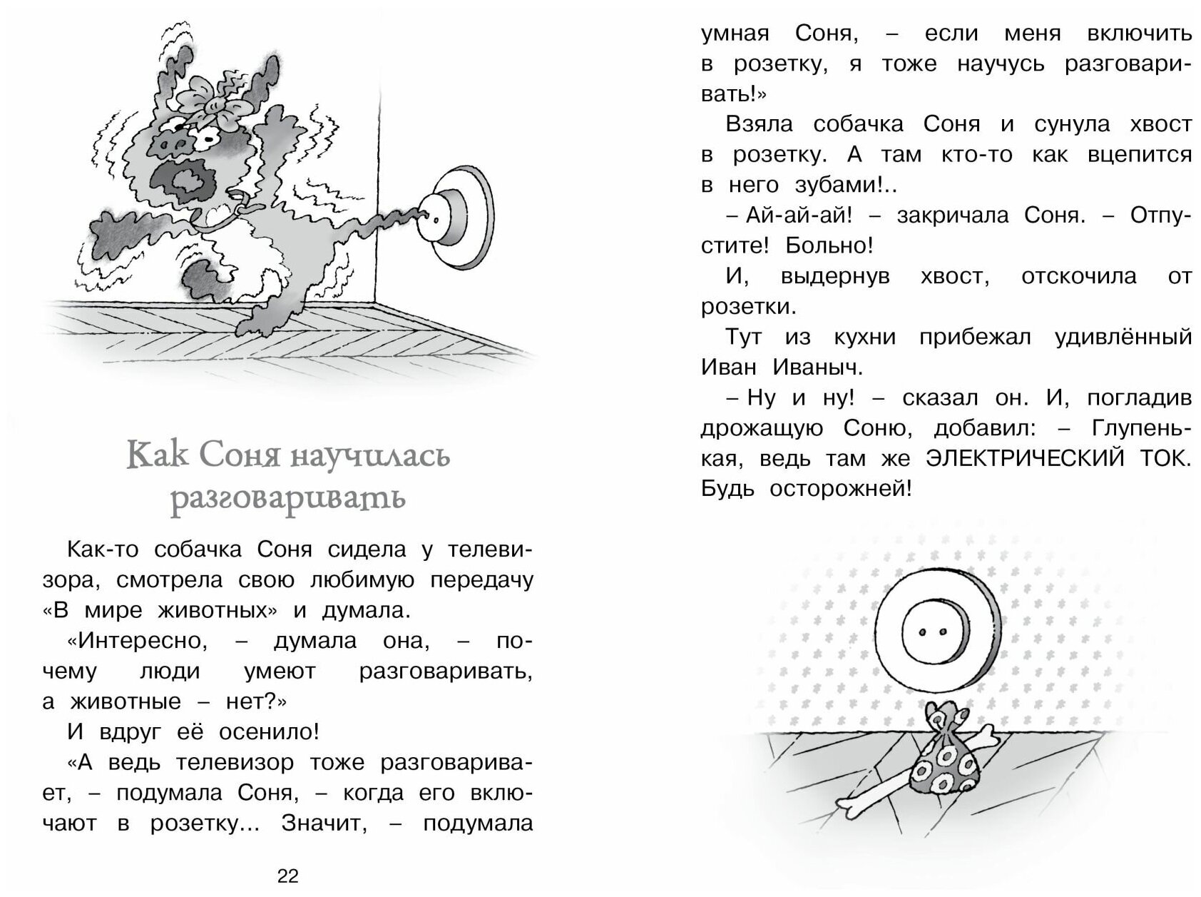Покупала в подарок детям 6 и 3 лет. Девочкам очень понравились озорные и коротенькие рассказы про "ну очень умную собачку Соню", которая в любой ситуации находит (как и любой ребёнок) необычный выход и не стандартное решение любых проблем. Сразу скажу что рисунки в книжке черно-белые, но красивые, художник Е. Соколов постарался забавно изобразить как саму Соню, так и остальных героев рассказов Андрея Усачева, поэтому моим детям нравится их с интересом рассматривать. По качеству издания могу отметить, что листы в книге белые, шрифт не мелкий, старшая дочь читает короткие рассказы сама и с большим удовольствием потом пересказывать младшей. Книгой все остались довольны.