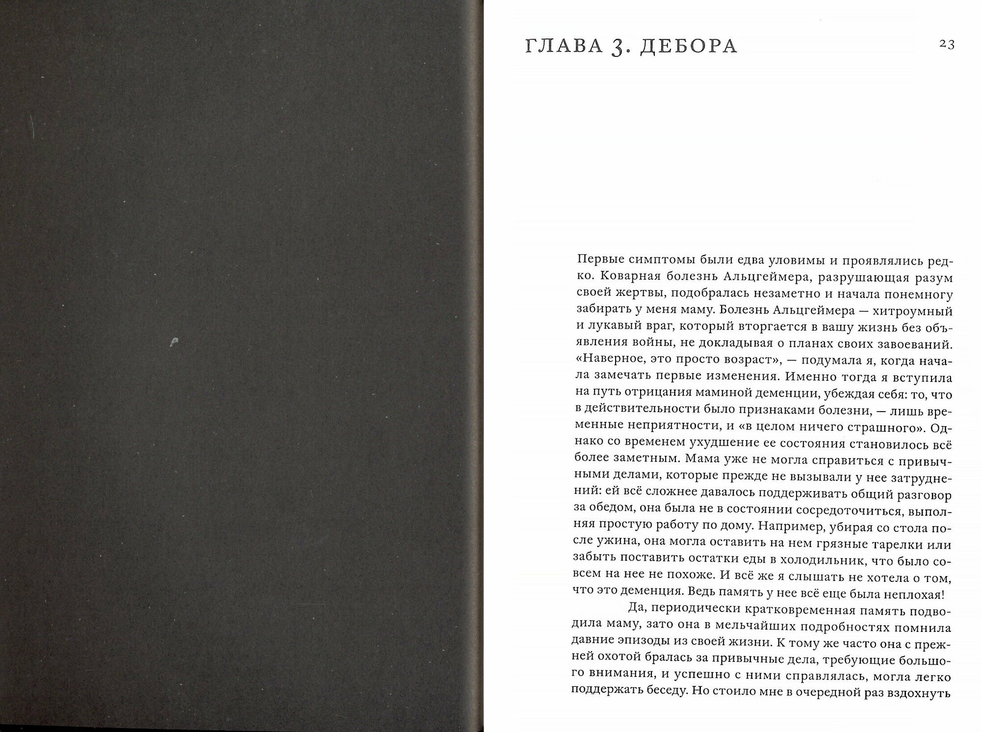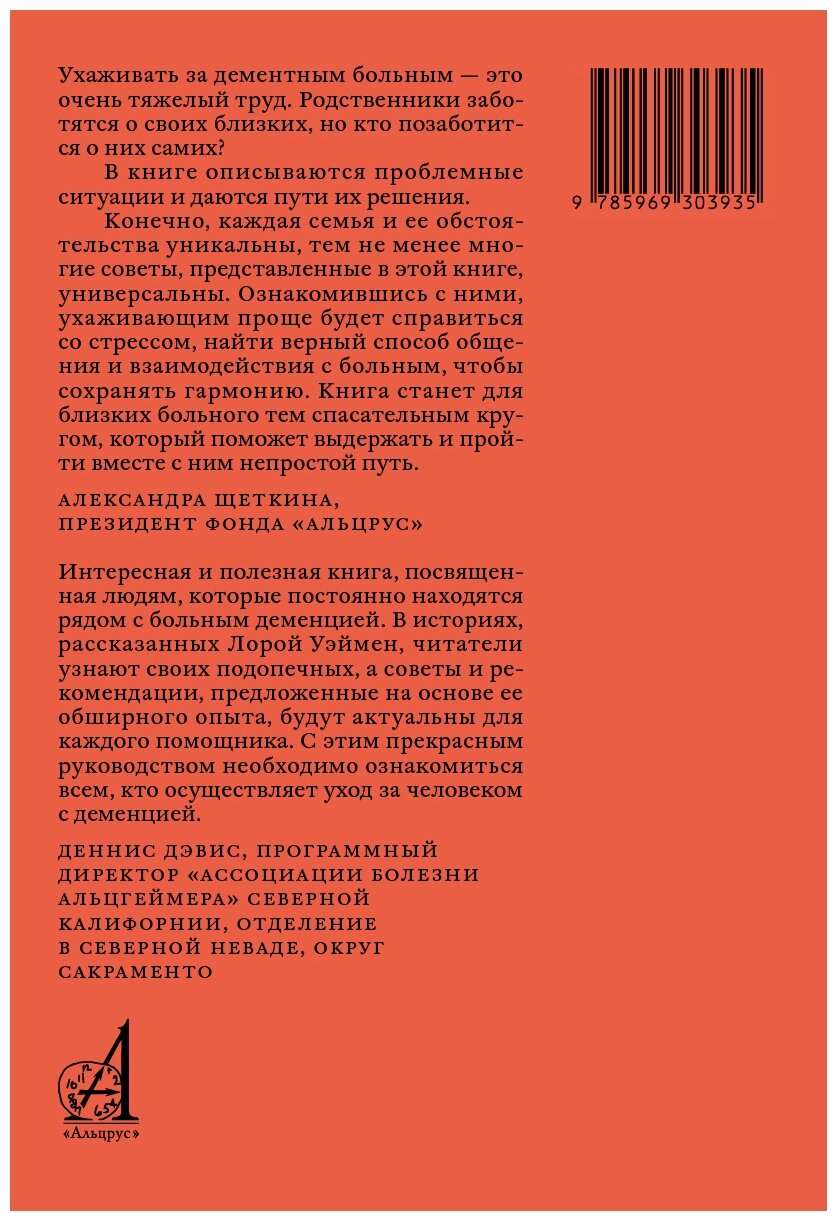 Отличная книга. Особенно хорош метод «положительного ответа». Не стоит спорить с человеком с признаками деменции, наоборот, буквально во всем соглашаться, делать это обязательно спокойно и вежливо (люди с деменцией лучше считывают наше эмоциональное состояние нежели смысл слов). А уже потом простыми фразами (утверждениями)направлять человека в нужное русло. В общем книга и о страдающих деменцией и о тех, кто о них заботится. Книга о том, как сделать контакт более приятным и комфортным для обоих и даже не смотря на деменцию получать удовольствие от общения.