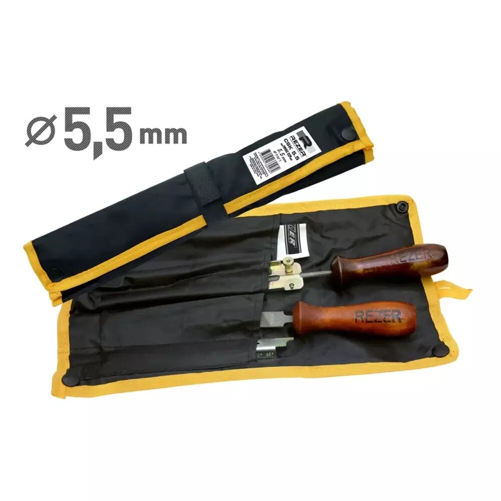 В комплект набора для заточки цепей Rezer входят:плоский напильник с деревянной ручкой;шаблон для заточки цепи с круглым напильником и деревянной ручкой;калибр для контроля углов заточки цепи, для регулировки высоты зуба, ограничивающего глубину реза, а также для чистки направляющего паза и смазочного отверстия пильной шины;инструкция;текстильная сумка-чехол на застежках с креплением для поясного ремня.