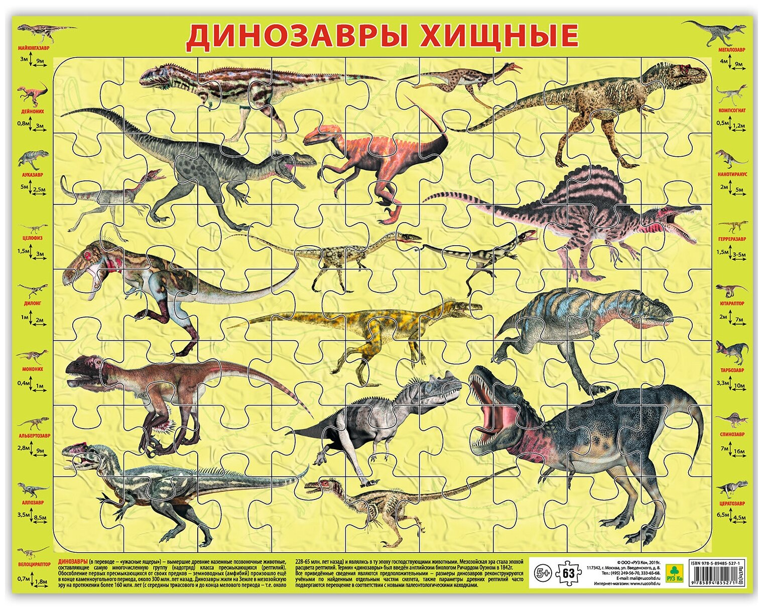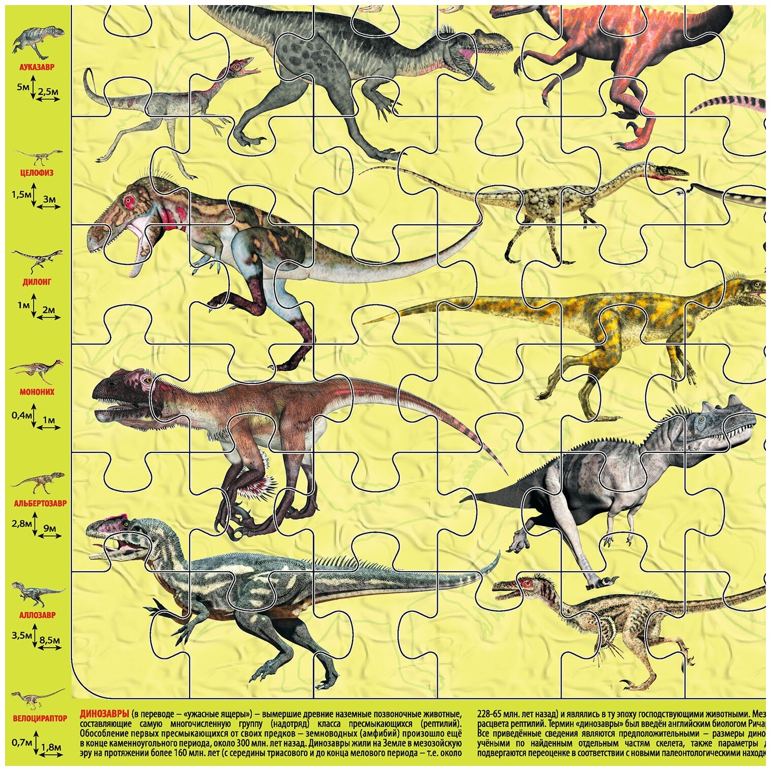 Пазл детский на подложке. Знакомит детей с хищными динозаврами. Помогает развитию мышления и мелкой моторики. На рамке даны названия и краткие характеристики изображенных объектов. Формат 36х28 см, 63 элемента.