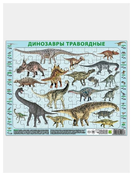 Пазл детский на подложке. Знакомит детей с травоядными динозаврами. Помогает развитию мышления и мелкой моторики. На рамке даны названия и краткие характеристики изображенных объектов. Формат 36х28 см, 63 элемента.