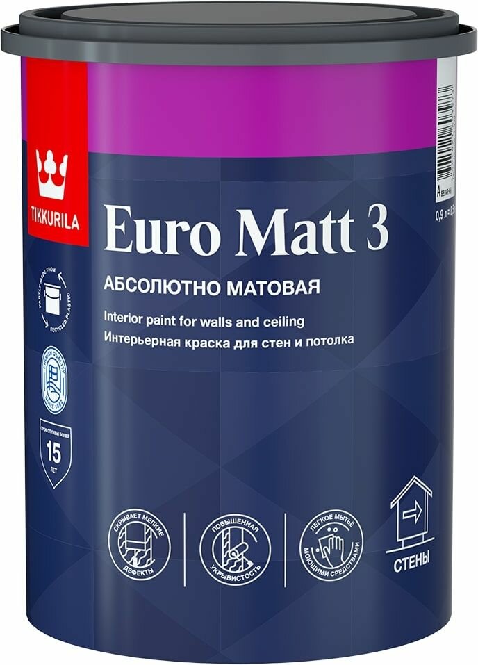 Euro Matt 3 Абсолютно матовая Глубокоматовая водно-дисперсионная краска для высококачественной отделки стен и потолков • Идеальная для гостиных и спален • Высочайшая укрывистость и меньше слоев • Экологичная и безопасная Идеальная для гостиных и спален Хорошая краска для гостиной, спальни или детской – самый ответственный выбор, не правда ли? Доверьтесь Euro Matt 3, ведь эта краска гарантирует превосходное качество глубокоматовых поверхностей стен, идеальную и полную гамму цветов. Она создана специально для окраски стен и потолков жилых комнат: спален, гостиных и детских. Кроме того, устойчивое к мытью покрытие выдержит более 5000 проходов щеткой. Вы сможете легко поддерживать в доме чистоту, протирая стены без ущерба для внешнего вида поверхностей, когда это понадобится. Высочайшая укрывистость и меньше слоев Перекрашиваете стены заново? Или красите по свежей отштукатуренной поверхности? Euro Matt 3 справится с любой задачей! Благодаря великолепной укрывистости, краска подходит как для первичной покраски, так и для нанесения на покрашенные ранее поверхности. Ее усовершенствованные малярные свойства позволяют достичь отличного результата при нанесении всего 1-2 слоев. Экологичная и безопасная Вы не любите запах краски и переживаете за свое здоровье и здоровье своих близких во время покраски? Выбирайте Euro Matt 3! Эта краска обладает нейтральным запахом. Она безопасна для здоровья и соответствует европейским экологическим нормам по содержанию летучих органических веществ (Евродиректива VOC). Также Euro Matt 3 может использоваться в детских учреждениях и помещениях административной группы лечебно-профилактических учреждений