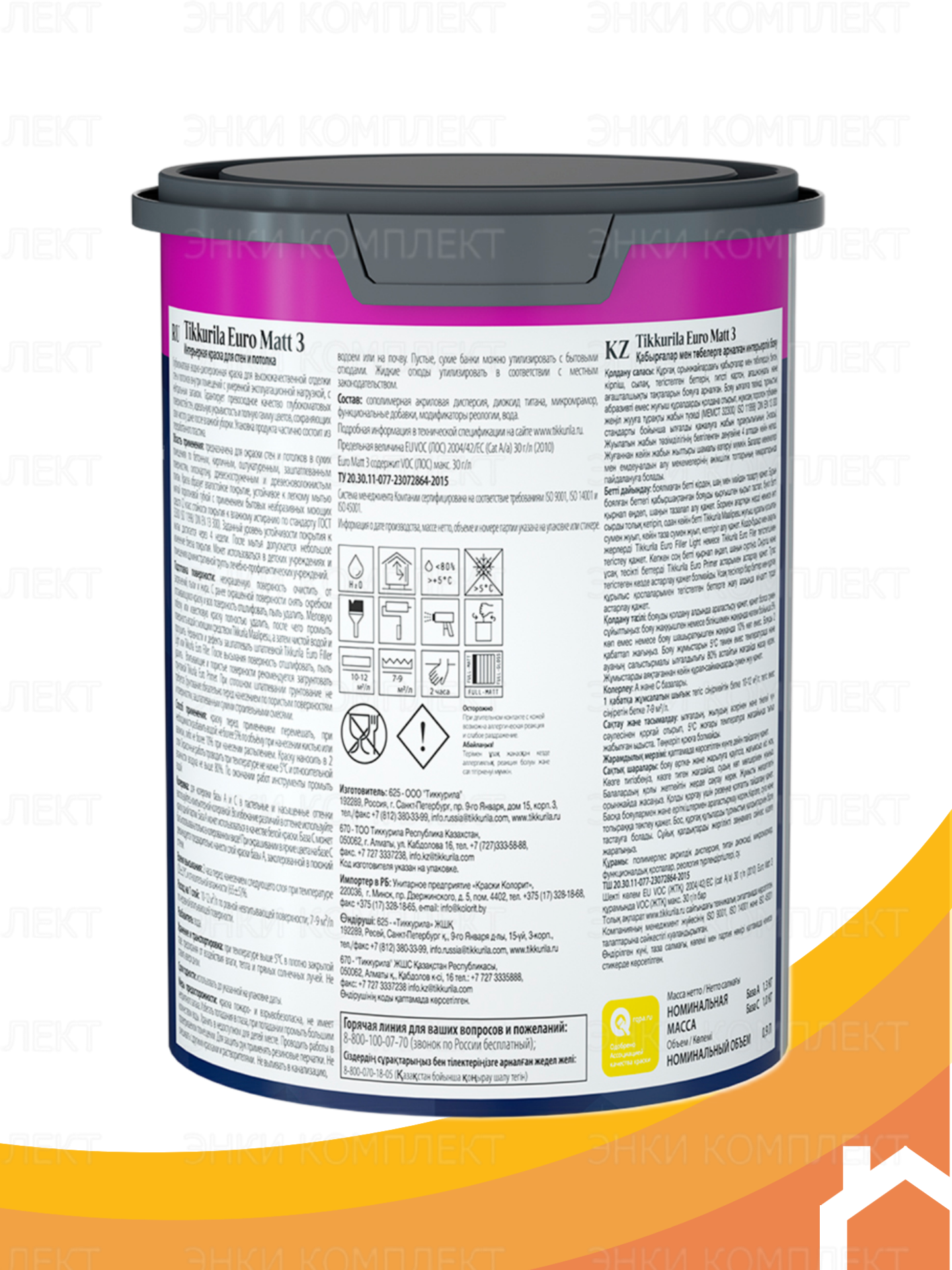 Водоразбавляемая краска для стен и потолков. Высочайшая укрывистость и меньше слоев Перекрашиваете стены заново? Или красите по свежей отштукатуренной поверхности? Tikkurila Euro Matt 3 справится с любой задачей! Благодаря великолепной укрывистости, краска подходит как для первичной покраски, так и для нанесения на покрашенные ранее поверхности. Ее усовершенствованные малярные свойства позволяют достичь отличного результата при нанесении всего 1-2 слоев. Экологичная и безопасная Вы не любите запах краски и переживаете за свое здоровье и здоровье своих близких во время покраски? Выбирайте Tikkurila Euro Matt 3! Эта краска обладает нейтральным запахом. Она безопасна для здоровья и соответствует европейским экологическим нормам по содержанию летучих органических веществ (Евродиректива VOC). Также Tikkurila Euro Matt 3 может использоваться в детских учреждениях и помещениях административной группы лечебно-профилактических учреждений. Цвет (База A, C) Для получения пастельных оттенков воспользуйтесь компьютерной колеровкой Tikkurila. База A может использоваться в качестве белой краски. База С используется только в колерованном виде. При окрашивании в яркие цвета на базе С рекомендуется предварительно нанести слой краски базы А, заколерованной в похожий оттенок. Условия при окраске Окрашиваемая поверхность должна быть сухой и чистой. Окрасочные работы проводить при температуре не ниже 5°С и относительной влажности воздуха не выше 80%. Смешивание компонентов При необходимости разбавить водой: не более 5% по объёму при нанесении кистью или валиком, либо не более 10% при нанесении распылением. Предварительная подготовка Неокрашенные поверхности: Поверхность очистить от загрязнений, пыли и жира. Впитывающие и пористые поверхности рекомендуется загрунтовать грунтовкой Tikkurila Euro Primer. При сплошном шпатлевании грунтование не требуется. Грунтование обязательно перед нанесением по пористым поверхностям и поверхностям, зашпатлеванным сухими строительными смесями. Ранее окрашенные поверхности: С ранее окрашенной поверхности снять скребком отслаивающуюся краску и всю поверхность отшлифовать, пыль удалить. Меловую побелку или известковую краску полностью удалить, после чего промыть поверхность водой с моющим средством Tikkurila Maalipesu, а затем чистой водой и просушить. Неровности и дефекты зашпатлевать шпатлевкой Tikkurila Euro Filler или Euro Filler Light. После высыхания поверхность отшлифовать, пыль удалить, загрунтовать грунтовкой Tikkurila Euro Primer. Окр