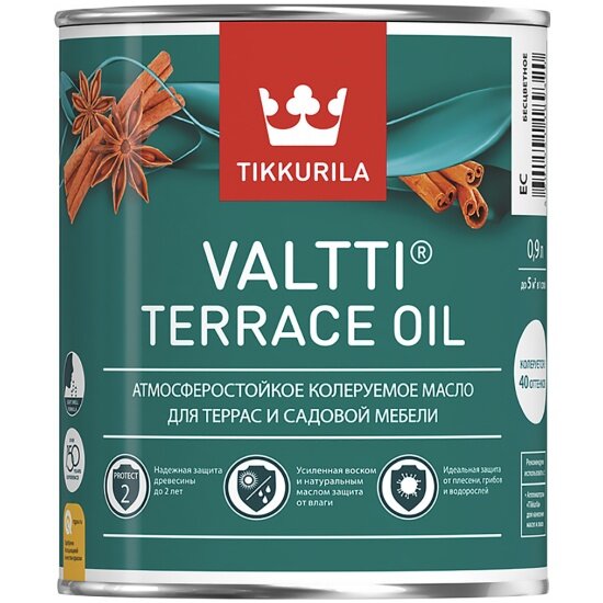 **Масло для террас и садовой мебели Tikkurila Valtti Terrace Oil** - органоразбавляемое масло, содержащее воск, для защиты и отделки деревянных поверхностей снаружи помещений. Предназначено для защиты и отделки новых или обработанных ранее маслом деревянных поверхностей (террасы, лестницы, садовая мебель, причалы и т.д.), пропитанной (под давлением) и термообработанной древесины, поверхностей из твердых или ценных пород дерева снаружи помещений. Эффективно защищает от влаги, плесени, грибков и уменьшает растрескивание деревянной поверхности. Может применяться снаружи без дополнительной колеровки. Рекомендуется использовать колерованный продукт, так как он обладает лучшими атмосферостойкими свойствами.
